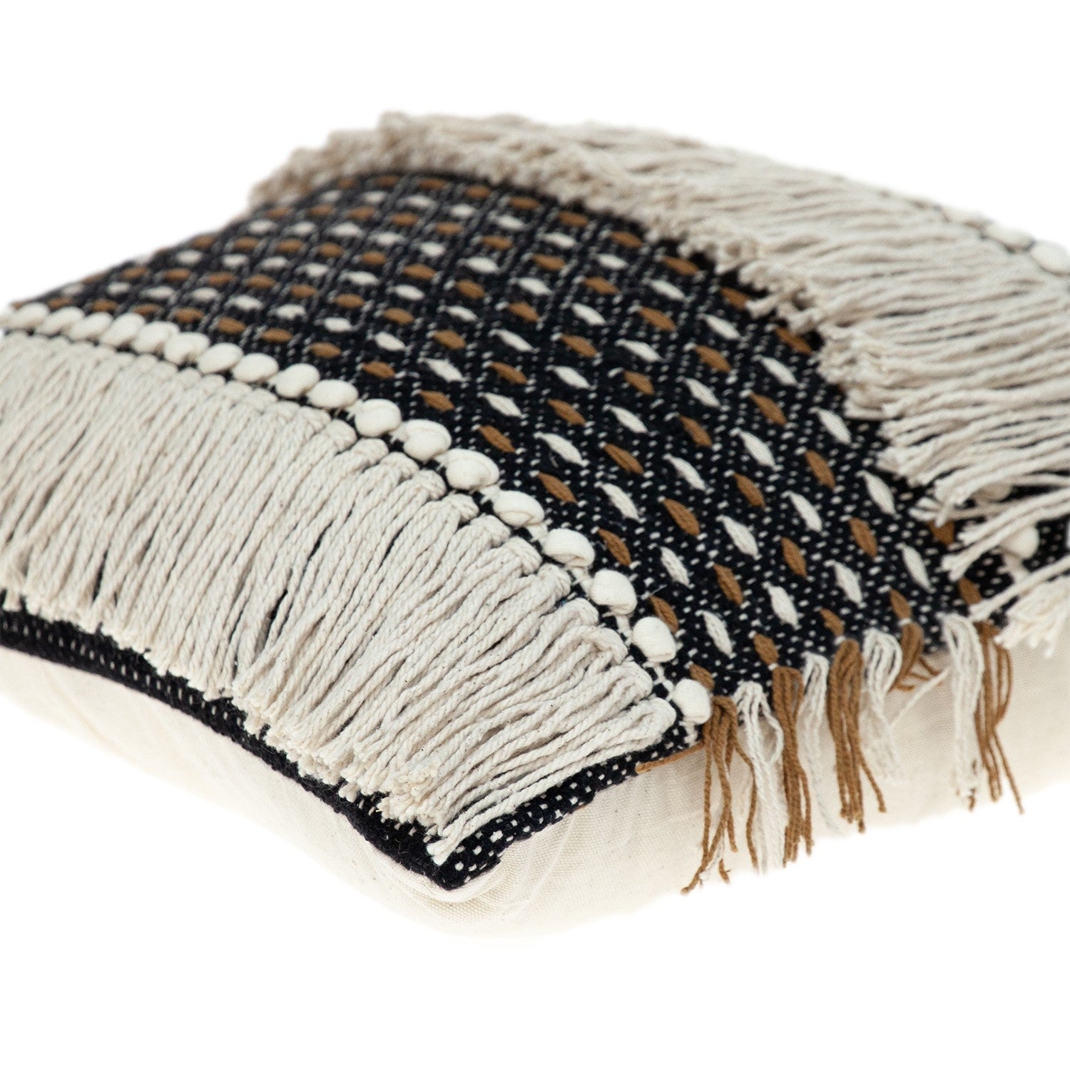 Make your favorite armchair warm and cozy for this fall and winter with this Black and Ivory Textured Throw Pillow. This pillow has a dark background in black, filled with different textures in ivory and brown colors, which include lines, knots, and fringes. Its hand woven pattern makes it blend well anywhere, and there is a zipper closure on the back. 17.72” x 17.72” x 4”