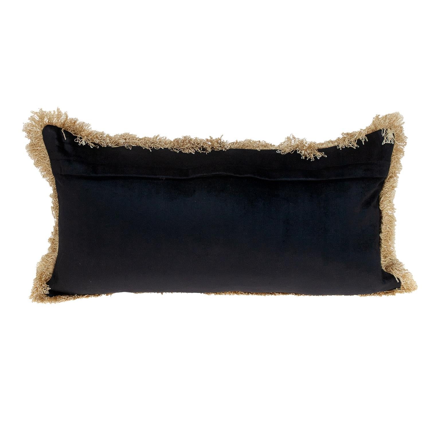 Make a statement with the Boho Black with Gold Fringe Decorative Lumbar Throw Pillow and showcase your room's personality. Made from an all velvet material, the bold dual tones of the throw pillow adds an eclectic touch to your monotonous space. This Boho styled pillow is practical with a predominant gold fringe suitable for a wide range of homes. Owing to it's bold colors they stand apart and are a great way to add some color to your space. It's classic and elegant look helps to bring some character to your home. The square gold border embellishment makes it an eye catching throw pillow that is best suited for your couch, bed or accent chair. 12" x 24" x 4"