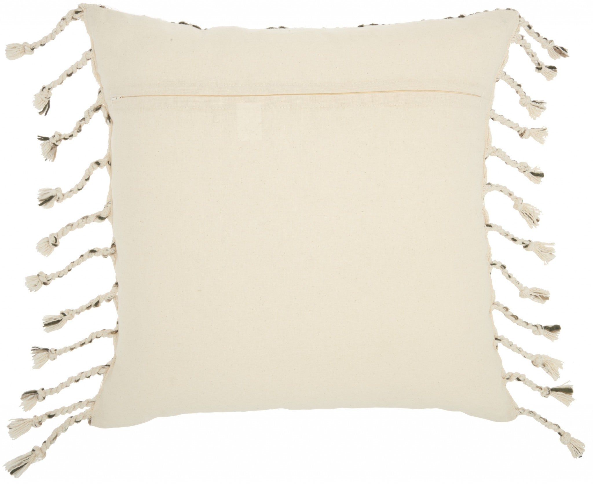 With this Brown and White Grid Detail Throw Pillow you can add a touch of natural design to your home without worrying about any clashing colors or design aesthetics. This pillow is covered in a soft and luxurious fabric which has a grid pattern on it. The grid pattern has small squares which are lined with slight swatches of different shades of brown. There is extra stitch detailing on the surface as well to add a textural element. The tassels on either side are braided and are made of threads that have the same white and brown colorway. A great way to have unmatched comfort and a refreshed design feel, this pillow will look great on the bed, on the couch, or any chair you have in your home. 5" H x 20" W x 20" D
