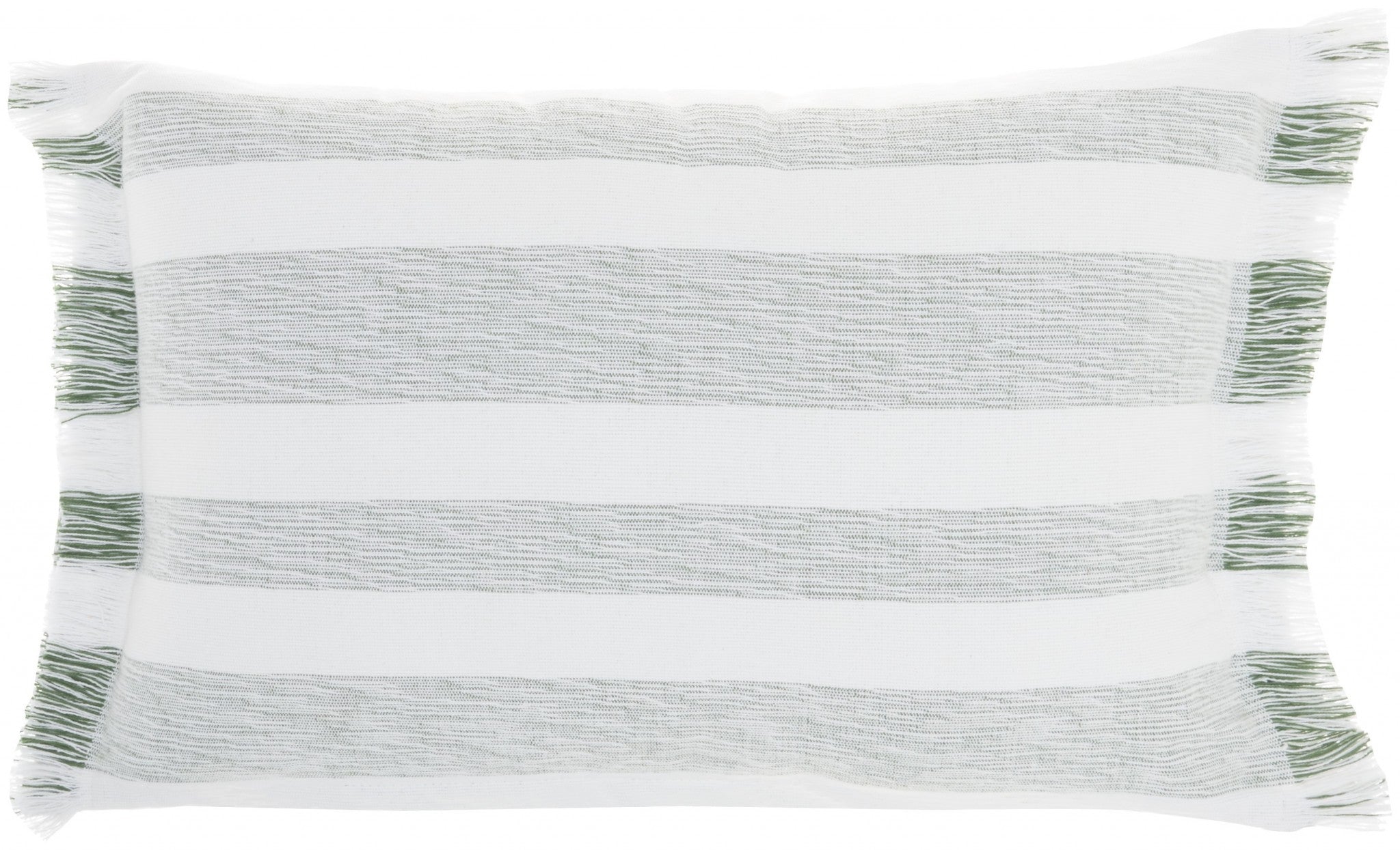 Induce a sense of warmth and coziness into your place with this Green and White Soft Stripes Rectangular Throw Pillow that flaunts a relaxed and laid-back feel in its simplicity. Showcasing clean-lined alternating stripes in pastel hues of fern green and creamy white in the middle with ornamental fringes on the edges gives off a farmhouse appeal. Made to stand the test of time, this 100% cotton-made pillow is super durable, easy to clean, and more breathable. Pair this soft and sumptuous throw pillow with neutral shades or vibrant hues for a blissful harmony or a striking contrast. 14” x 20”x 5"