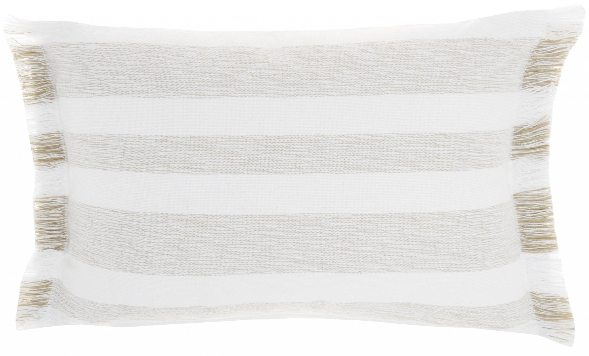 Induce a sense of warmth and coziness into your place with this Taupe and White Soft Stripes Throw Pillow that flaunts a relaxed and laid-back feel in its simplicity. Showcasing clean-lined alternating stripes in pastel hues of taupe and creamy white in the middle with ornamental fringes on the edges gives off a farmhouse appeal. Made to stand the test of time, this 100% cotton-made pillow is super durable, easy to clean, and more breathable. Pair this soft and sumptuous throw pillow with neutral shades or vibrant hues for a blissful harmony or a striking contrast. 14” x 20”x 5"