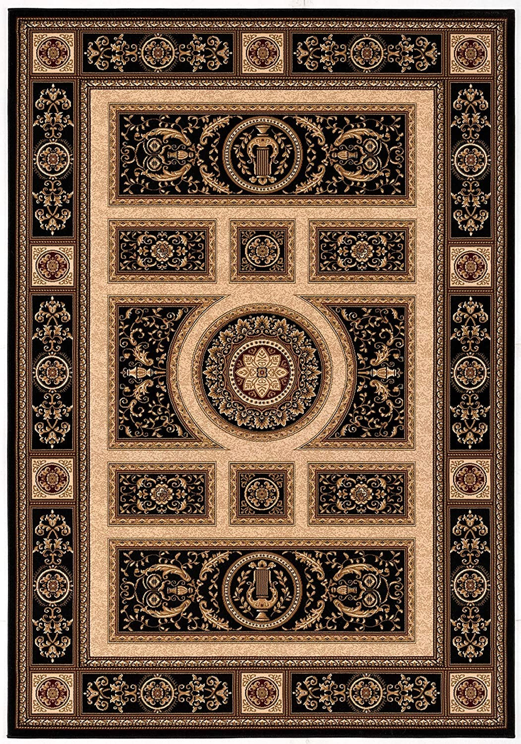 Standing out with rich embellishments, this stunning Round Black and Beige Traditional Geometric Area Rug is a pure representation of traditional luxury with modern grace. The classic combination of black and beige is exaggerated in the extravagant decorative details and geometrics of the entire piece. Boasting the finest skills of Turkish artisans, this rug is made of 100% olefin heatset fibers for enhanced durability and stain resistance to withstand heavy wear and tear while staying true to its immaculate look. The smooth and luxurious surface texture is a result of the low pile construction that makes it easy to clean and provides a soft underfoot to fit well in a busy household. Achieve an elegant focal point into your living space with this gorgeous round area rug that will lead in both class and comfort. 63"