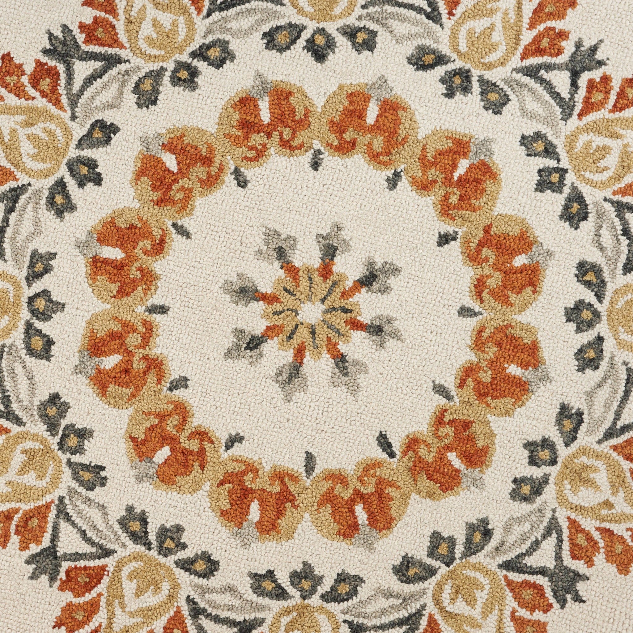 Define the aesthetics of traditional luxury with this Round Orange Boho Medallion Area Rug that expresses a hint of bohemian grace in a cheerful palette. The stunning floral medallion in burnt orange, gold, and hunter green on a cream-toned base strikes the eyes. To withstand the messes and scratches of high traffic areas indoors, this rug is hand-tufted with 100% virgin wool which is insulating, soft, and resilient to keep its shape and shine for long. The low pile adds to the plush surface texture to let you experience a luxurious underfoot for a cozy and inviting feel. The classy and playful combination of this area rug makes it an excellent accent to complement a variety of interior decors and uplift the ambiance of the whole place. 72”