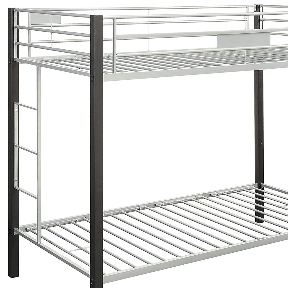 Build an inspiring and peaceful ambience around your kids room with our elegantly designed convertible twin over twin bunk bed. This collection is crafted to make your lads feel more homely. It features a metal construction equipped with easy access guard-rail on the top bed and a strong right facing front ladder. The convertible bunk can be used either stacked or as two separated beds, giving you a lot of creativity and flexibility on how to set up the room. Coming in a stunning silver and brown coffee metal finish with frame and sturdy slat system, this piece will surely be a creative addition to your kids space. Top bed not to be used for children below six years of age. The top has a weight capacity of 175Lbs while the bottom has 250Lbs. For residential use only.