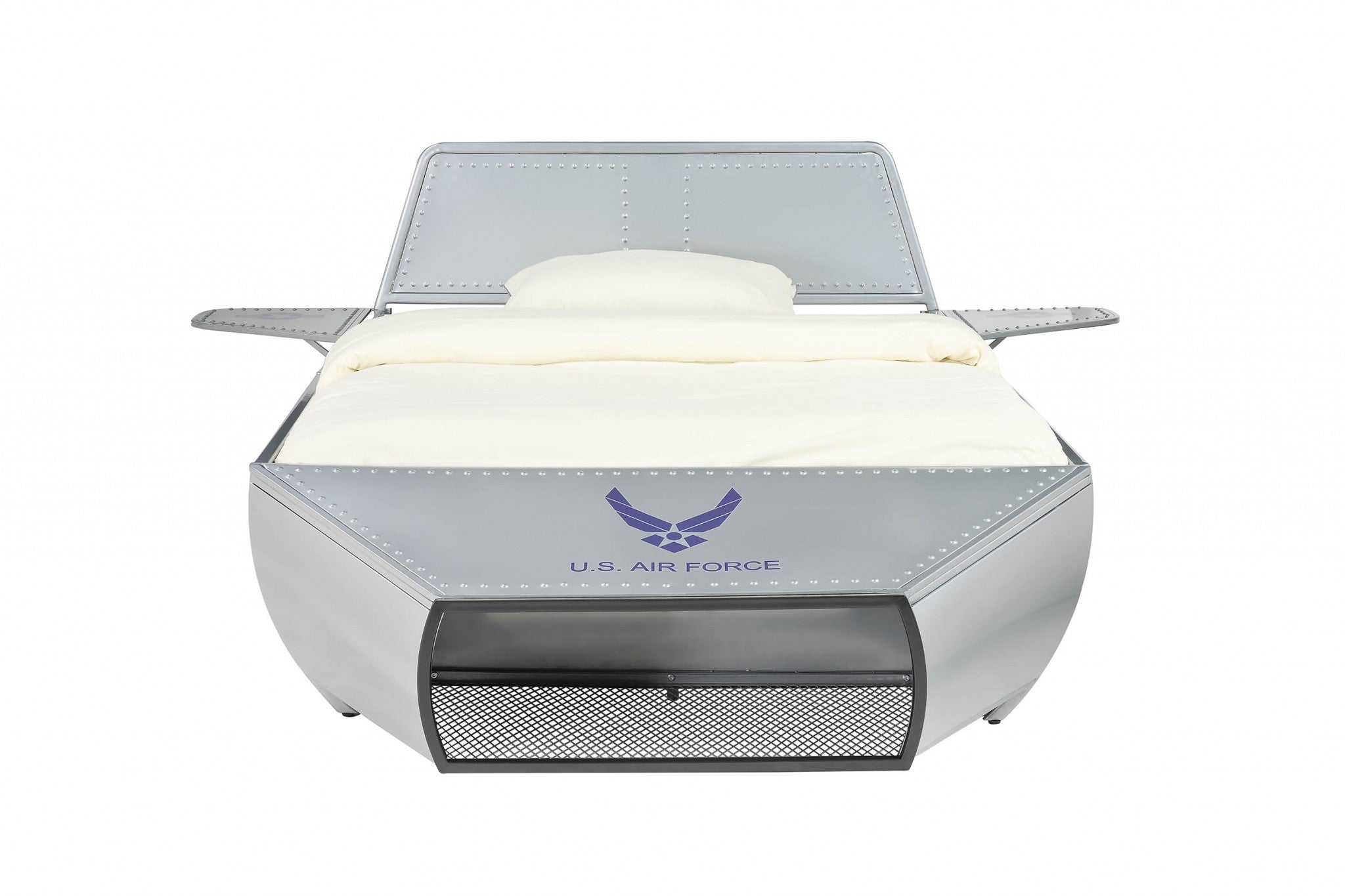 Delight your boy with this storage full bed designed to give blissful night rest. It is artfully crafted from metal to create a unique space shuttle theme that easily resonates. Featuring the US flag design and US Air Force inscription, the bed also comes with slat system for solid construction. It has a weight capacity of 500Lbs and slat system with 8 slats is included while box spring is not required.