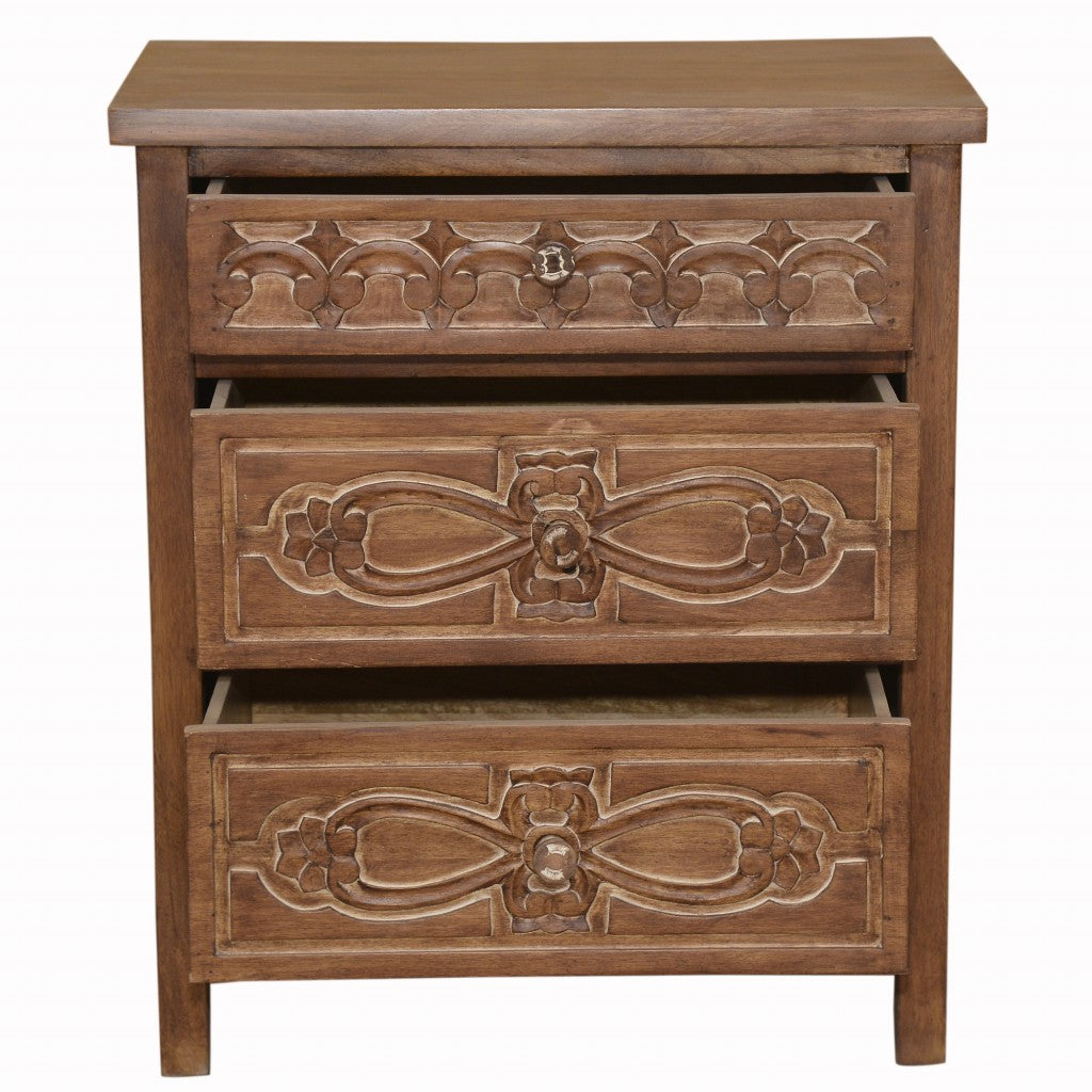 A true form of art, the Artisanal Handcarved Natural Wood Three Drawer Nightstand is a perfect addition to your bedroom but is so beaufiful and versatile it can be great as a decorative accent and storage cabinet in most any room in the house. With a rustic and handcrafted touch, the gorgeous genuine mango wood has elegant scrolling and patterning carved across all three of its drawer fronts. The warm natural mango brings with it natural grains, grooves, and knots that make this piece a true treasure. The natural stain with a slight white wash adds to the beauty and uniqueness of the piece. Complete with two larger drawers and the top one more narrow, this cabinet can help fight clutter and keep you organized in a most civilized and artistic way. 29" x 15" x 25".