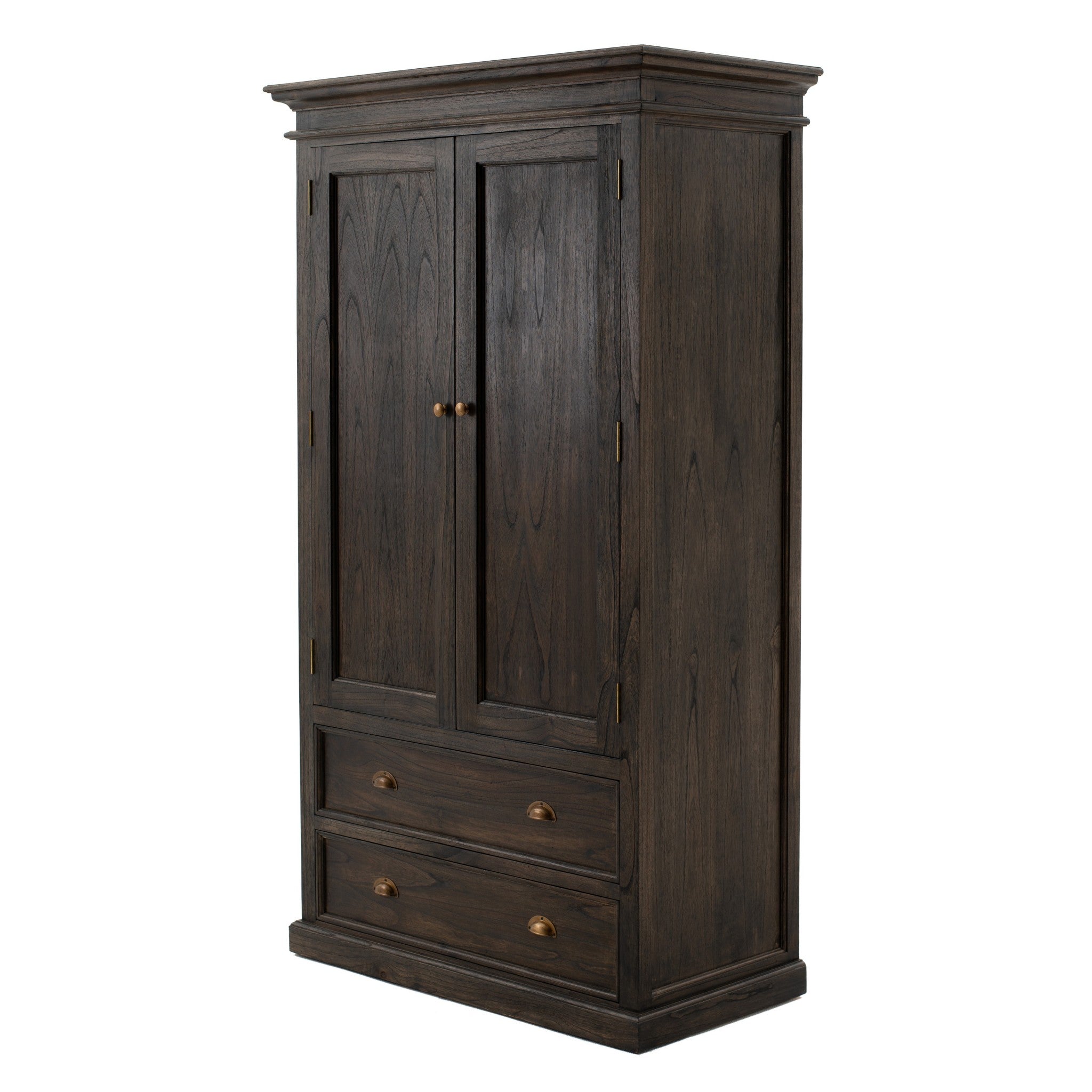 Exceptionally styled the Black Wash Wardrobe is sophisticated and elegantly designed to solve all your storing needs. Handcrafted from mindi wood with a black wash glaze finish, this wardrobe has a substantial amount of space with shaker style doors that open to reveal three shelves on the right and a hanger storage on the left. Two large drawers with antique brass cup pull handles are accommodated on the lower half of the wardrobe. Crown moldings and sharp edges complete the look of this grand structure. 74.8" x 43.31" x 21.65"