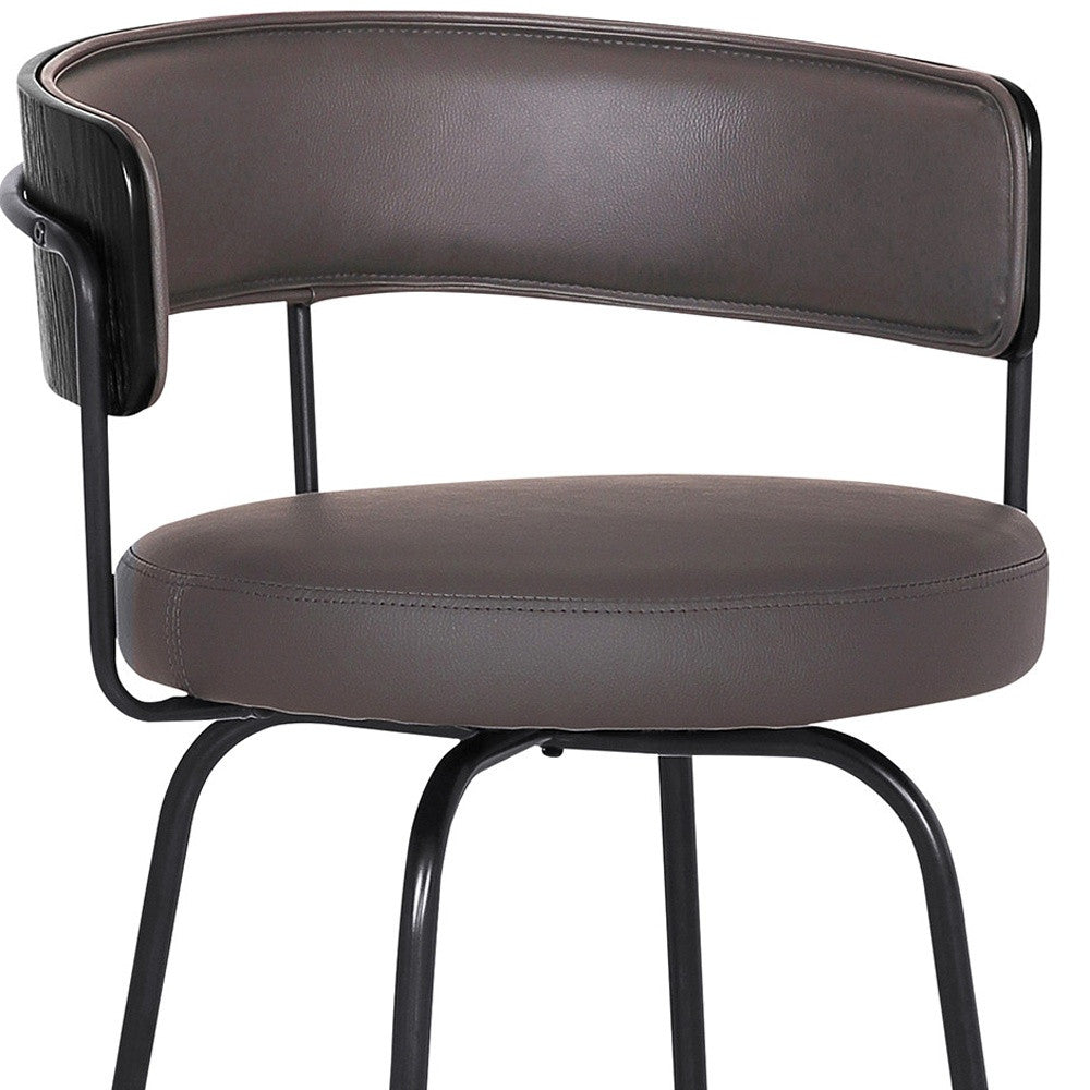 Enjoy every morning on your kitchen island in the comfort of this Gray Faux Leather Modern Swivel Bar Stool. Wrapped in a luxurious faux leather, the stool has a minimalist design combined with steel for the legs, giving a clean lined look to your interior. The stool is very versatile and swivels 360-degrees so you can sit facing any direction. The back of the seat is curved and padded to give comfort and the ring footrest ensures that you maintain good posture. The gray leather adds an element of richness to the stool and the black steel base is lightweight, making it easy to transport. The sturdy steel frame is finished using a black powder coat to ensure its shine doesn"t dull. Next to the kitchen counter or in the bar area, this stool brings the ideal combination of comfort and class to the home. The stool changes the ambiance in any room to be chic and sophisticated. 34” x 20.25” x 19.75”