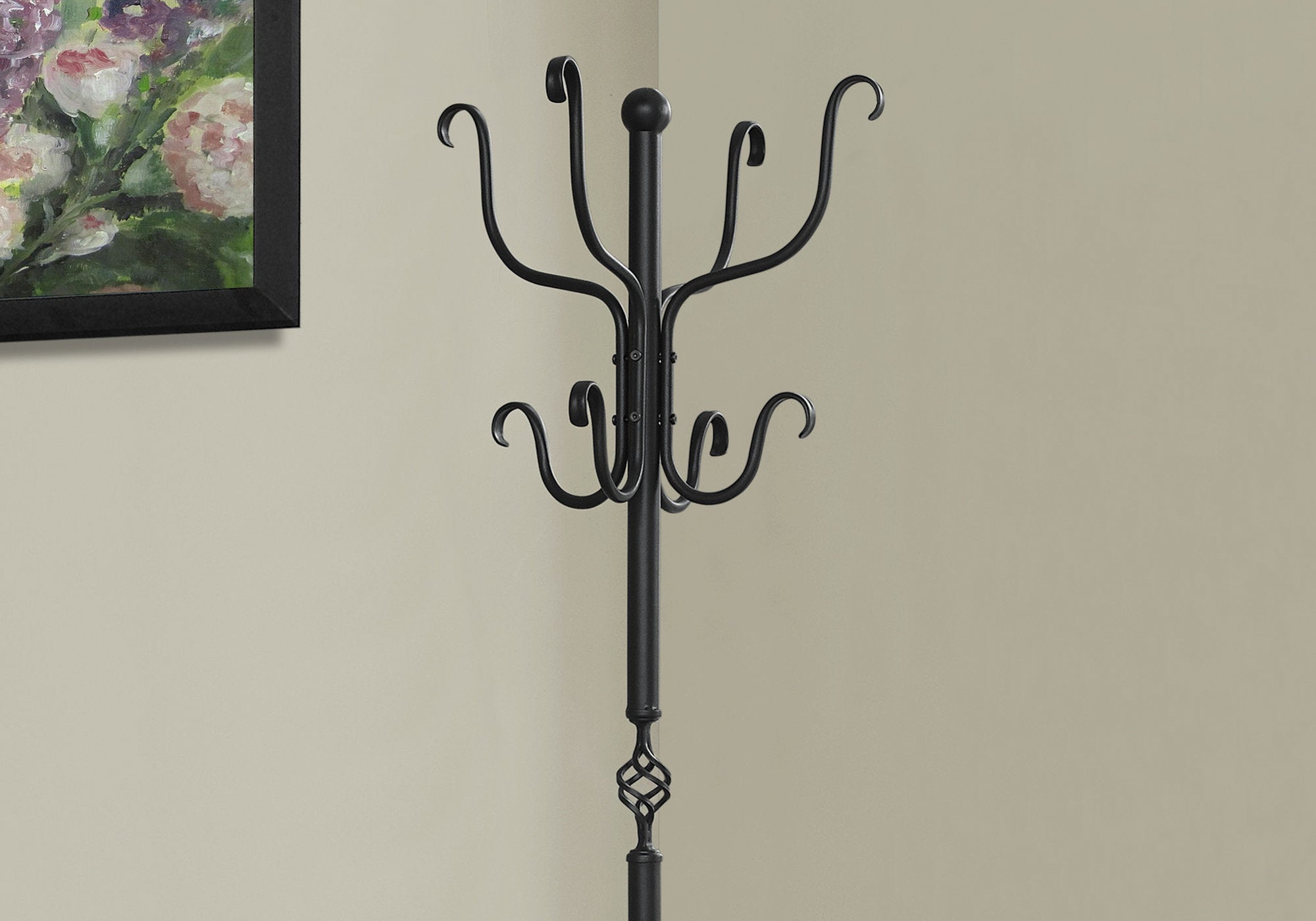 Enhance the look your entryway or hallway with this elegant traditional hammered black metal coat rack. A lovely accent piece on its own, this piece will help to keep you organized in style. The 8 hanging hooks allow you to keep everyday items like coats,