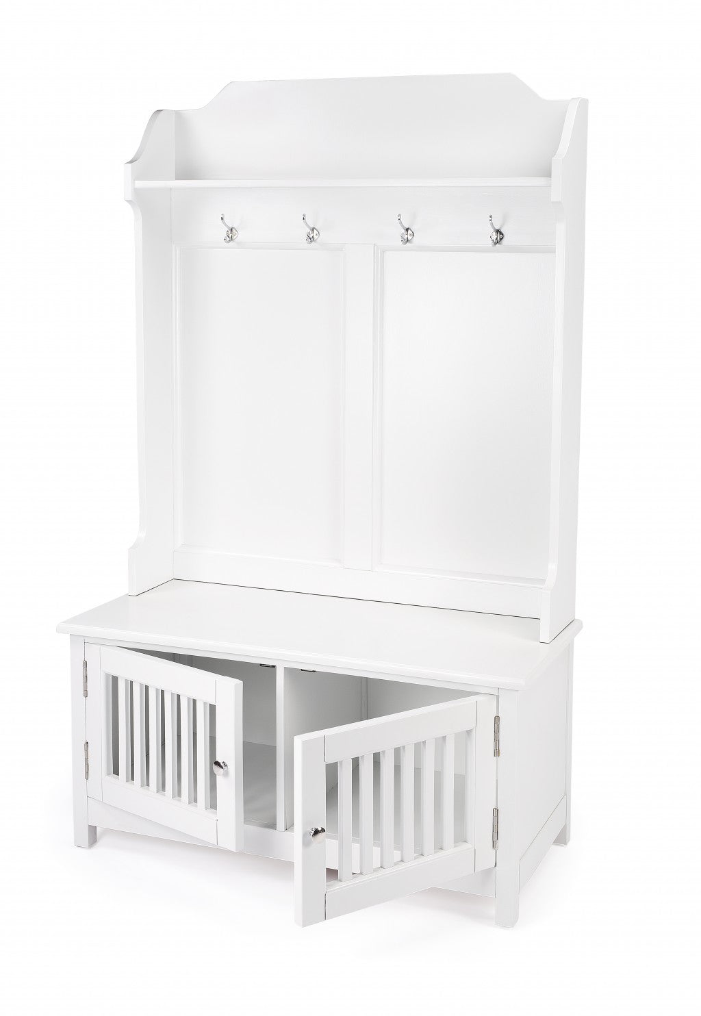 This delightful hall tree boasts abundant storage for jackets, scarves, handbags and more. Its classic cottage appearance is elevated by a crisp white finish and polished aluminum hooks and door pulls. It is crafted from mahogany and rubberwood solids with a convenient bench seat to put on and take off your shoes, and it boasts a top shelf to place smaller items like keys or a wallet and a storage cabinet behind each door below for bulkier items.