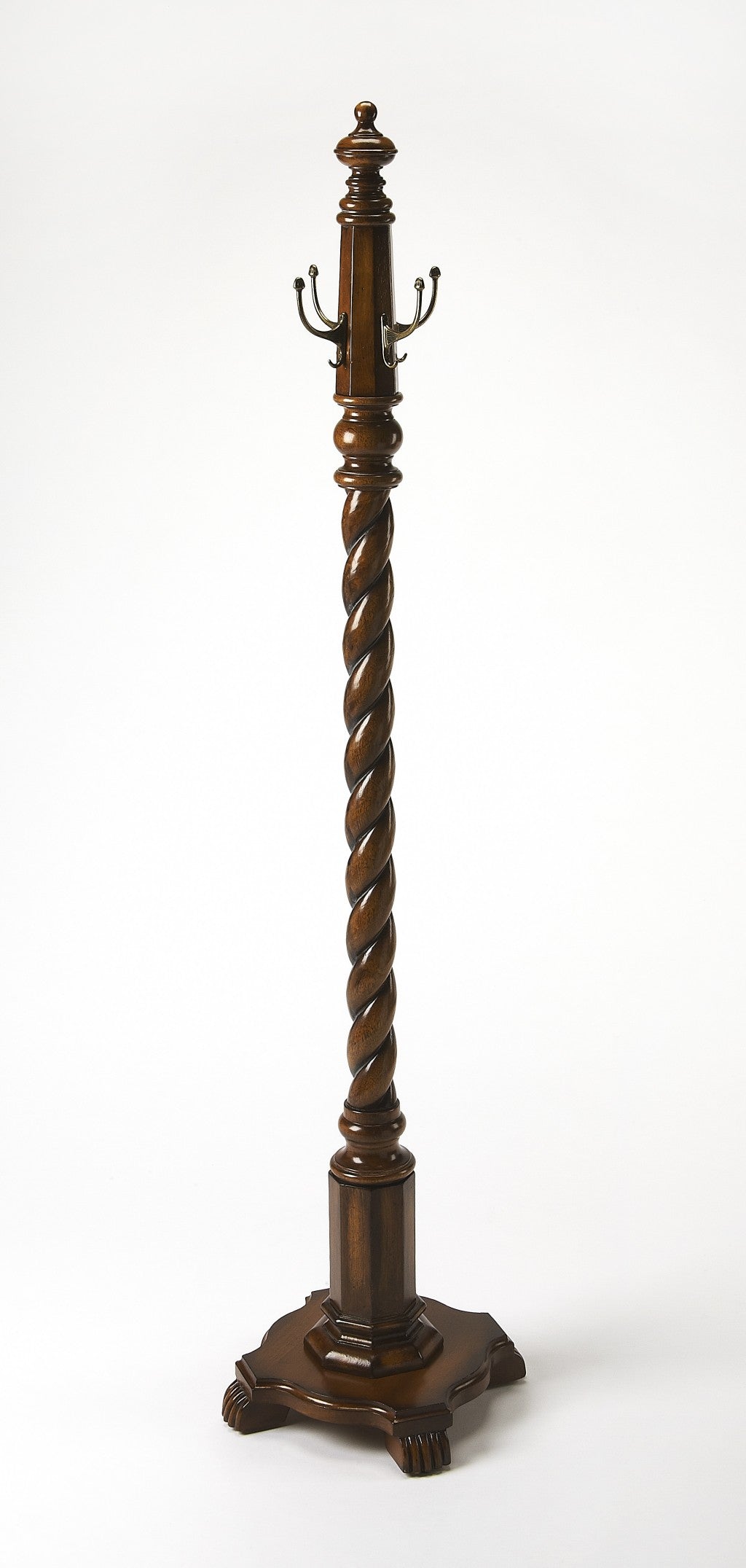 Understanding we all need a place to hang our hat, here is this handsome costumer with antique brass finished hardware on an elaborately carved pedestal. Great for hanging jackets, too, it is crafted from hardwood solids and oak veneers in a Vintage Oak finish.