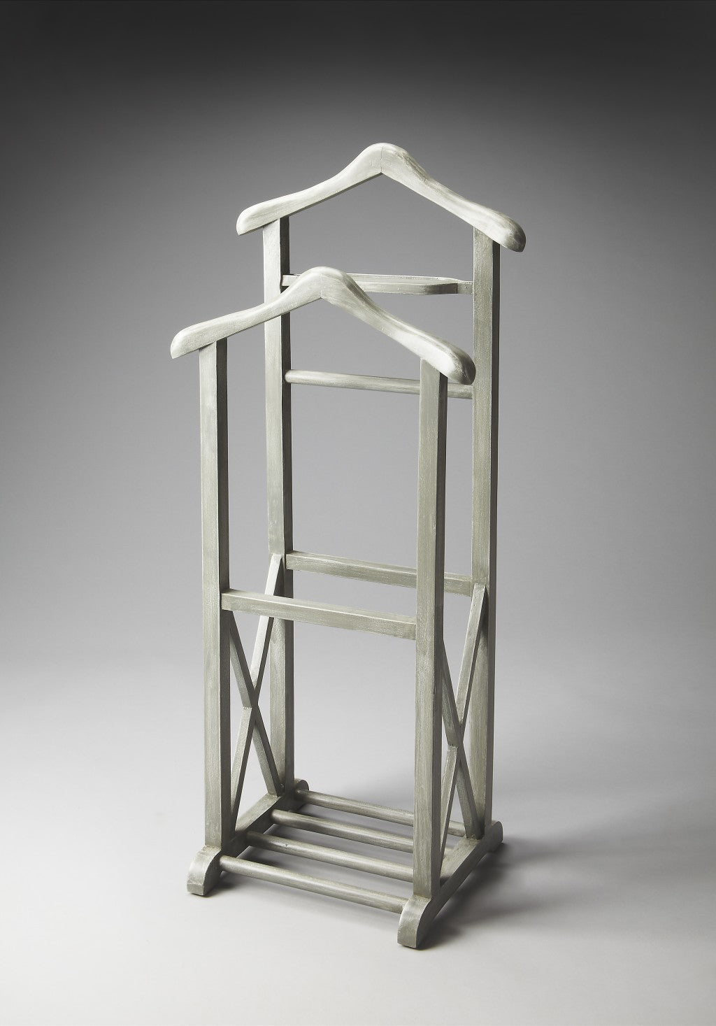 This Valet Stand, crafted from select solid woods and wood products, is as fashionable as it is functional in our Gray Dawn finish with the X-shaped lower side supports descending to the base anchored by four roads. It features a place to hang a coat, a shirt, pants and ties as well as a tray for keys, wallet, watch, pocket change and cufflinks.