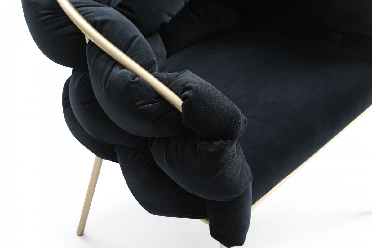 Add style and an eye-catching visual flair with the Black Geo Velvet and Champagne Gold Velvet Dining Chair. This uniquely designed dining chair features a metal tubular framing with a champagne gold finish that wraps around you in comfort. The velvet back and arms are stitched into hexagonal geometric cushions to comfort you and create a super unique and interesting look. The cushion seat itself is padded with a thick foam, adding to the superb comfort and support this chair brings. This chair is more than a dining chair and will aslo be a striking accent chair in living room, office, or bedroom. 32" H x 26" W x 23" D