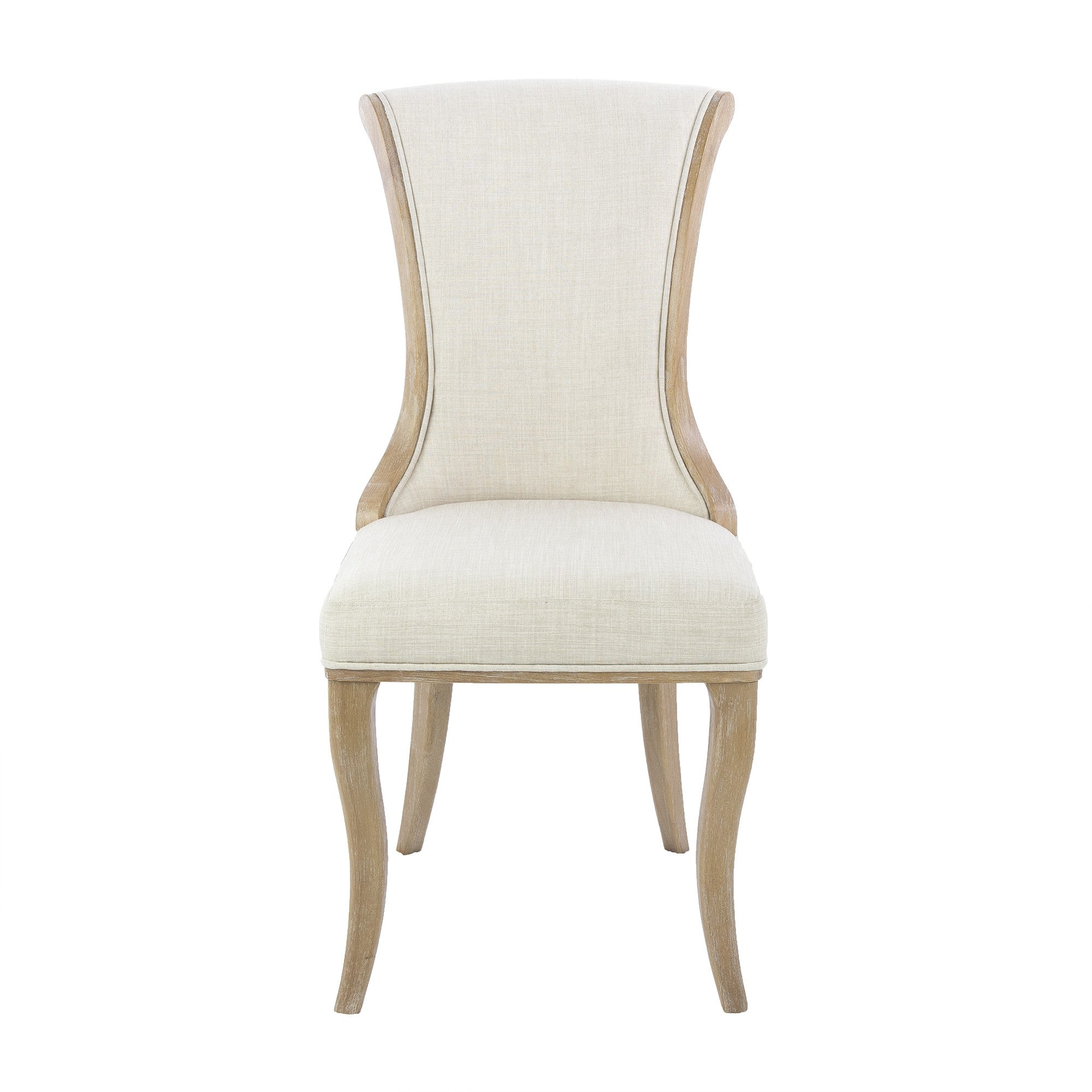 This beautiful set of two wood dining chairs is shabby chic meets rustic. Crisp and clean white linen upholstering will look fantastic with any home decor style, while the exposed wood frame adds a touch of updated rustic to your space. These chairs are great for dining but could be used as side or accent chairs