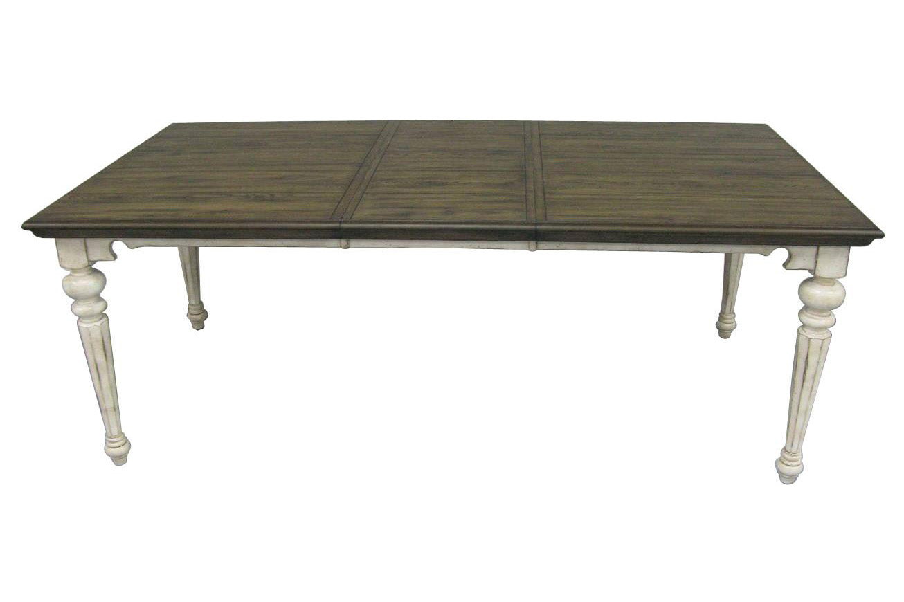 Bring back the quality and good looks of yester year with this Vintage Cottage White and Brown Hardwood Dining Table. A gorgeous distressed and antiqued creamy ivory white finish on the base and legs includes turned detailing and gives way to a plank style slate tabletop in a warm dark brown natural grain finish. This superbly well made table includes its own leaf for addition and subtraction and will overall be a great addition to your kitchen or dining room. 42" x 82 x 64".