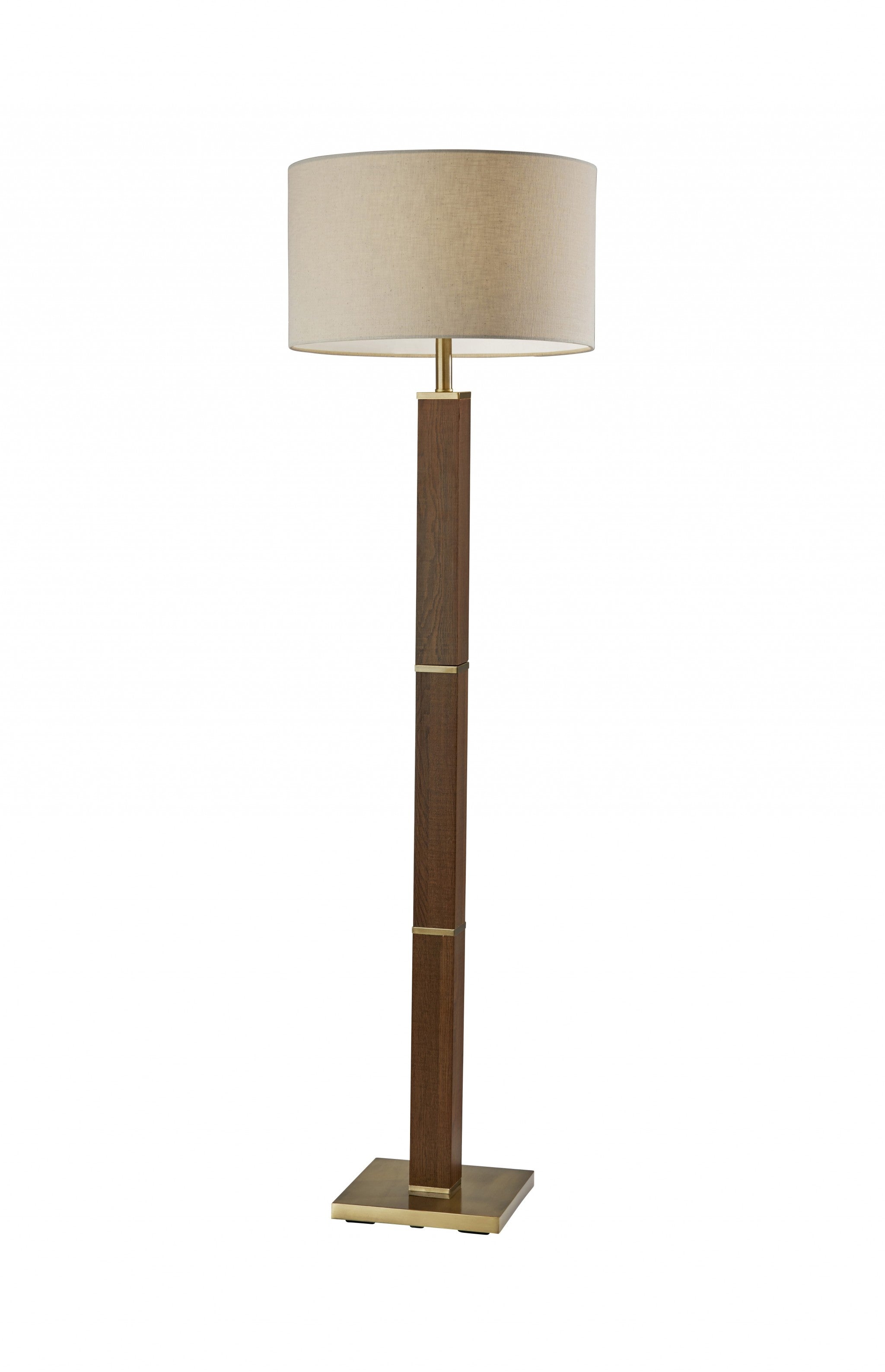 A modern silhouette with colonial charm, this pillar floor lamp elevates the look of your bedroom or living area. A vibrant walnut wood finish is mixed with antique brass metals and a cream textured fabric shade, creating a style that can fit perfectly into mid-century modern, art deco or colonial inspired homes. With a 61" height and a 2.5" thick square pillar, this lamp is a substantial piece of decor as well as a functional source of ambient lighting. A 3-way rotary socket switch controls a bulb up to 150W or an equivalent CFL. The 3-way rotary socket switch will only work with a 3-way light bulb, otherwise, this lamp will function with a simple on/off switch at its highest setting. All lighting product is either UL or ETL listed, meaning that it has been tested and approved to meet the government-regulated safety standards for the USA. Bulb is not included.