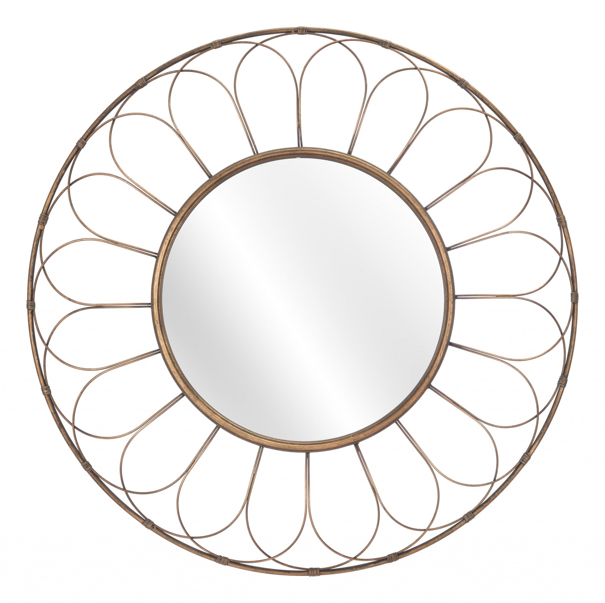 Add a touch of floral elegance to your home with this gold flower framed round mirror. The flower shape is made from stainless steel and features a minimal gold petal design arranged surrounded by a border that encases the petals. In the middle of the frame there is a round mirror which is bordered by a solid gold circle. Light bounces off of the gold petals beautifully and makes your room appear brighter and much larger. This mirror is sturdy yet light enough to hang anywhere is your home. A hardware kit is included in the package to help you hang the mirror up. Add a decorative element to your own home or gift this flower framed mirror to your friends and family. Product 33.1" H x 33.1" W x 2" D. Mirror 28" H x 16" W