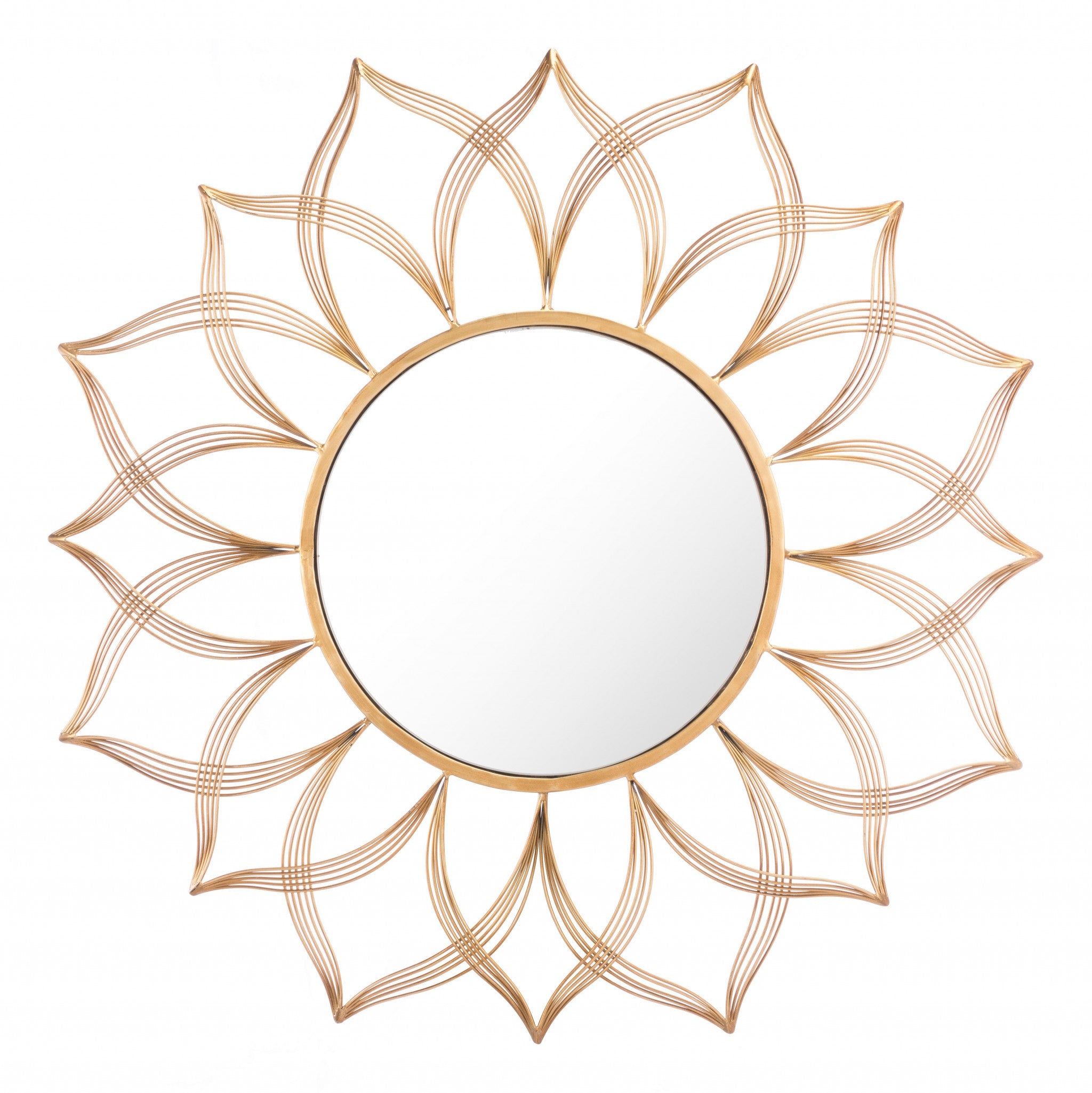 Add a touch of floral elegance to your home with this gold flower shaped round mirror. The flower shaped frame is made from stainless steel and features thin gold lines making up the flower shape. The petals are each their own piece and layered across two different rows add depth and dimension to the piece. In the middle of the frame there is a round mirror which is bordered by a solid gold circle. Light bounces off of the gold petals beautifully and makes your room appear brighter and much larger. This mirror is sturdy yet light enough to hang anywhere is your home. A hardware kit is included in the package to help you hang the mirror up. Add a decorative element to your own home or gift this flower shaped mirror to your friends and family. 27" H x 27" W x 0.8" D