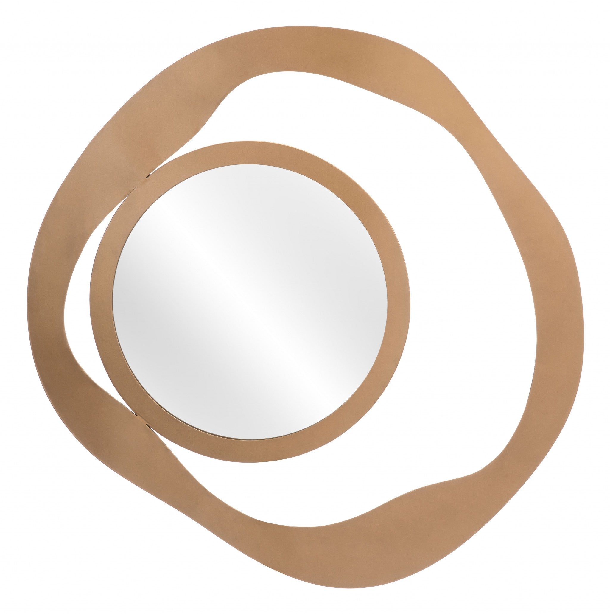 This Spiro Contemporary Gold Round Mirror is the perfect way to freshen up your home decor. This wild and wonky frame around the mirror is made from stainless steel and finished to matte gold finish. The design of the frame leans more modern and contemporary but will look great with any interior style you have. The round mirror in the middle sits a little to the left adding the perfect amount of whimsy to the whole frame. Light reflects off the surface of the frame and the mirror and makes your room look spacious and brighter. You can use this in your own home or gift it to your friends and family as a house-warming gift. 31.1"H x 33.1"W x 0.7" D.