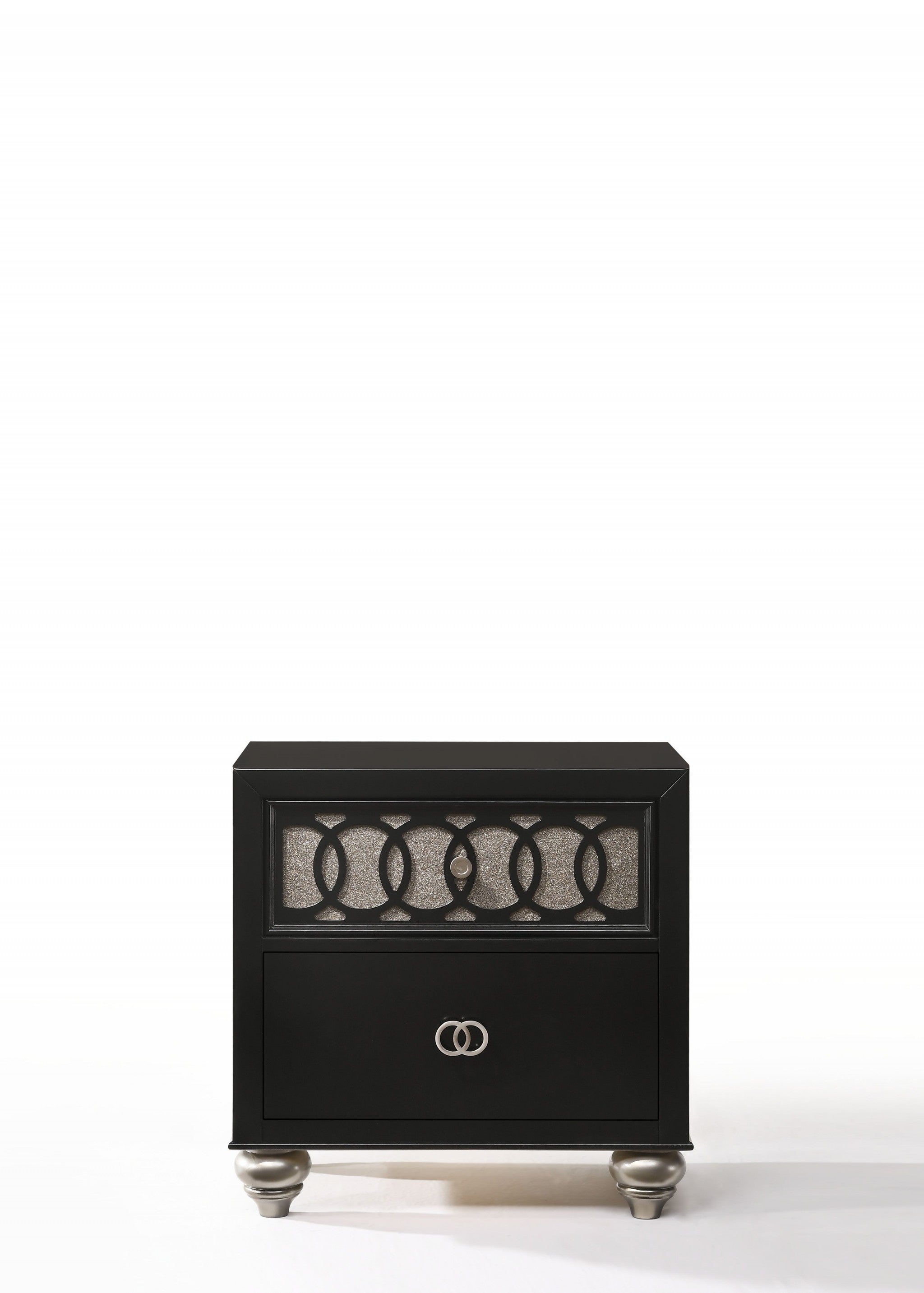Your bedroom or dressing room can get trendier with this stylish and highly functional nightstand. Our nightstand combines beauty and versatility to help get your room organized as well as brighten the atmosphere. It features top front drawers with raised geometric inlay and lower drawer with overlapped ring knob in nickel brushed metal that serve as a perfect storage space for your personal essentials. The rectangular top will be an ideal place to position your table lamp or flower pot. The dark wood finished frame combines well with the elegant front design to make this piece awesome addition to your living space.