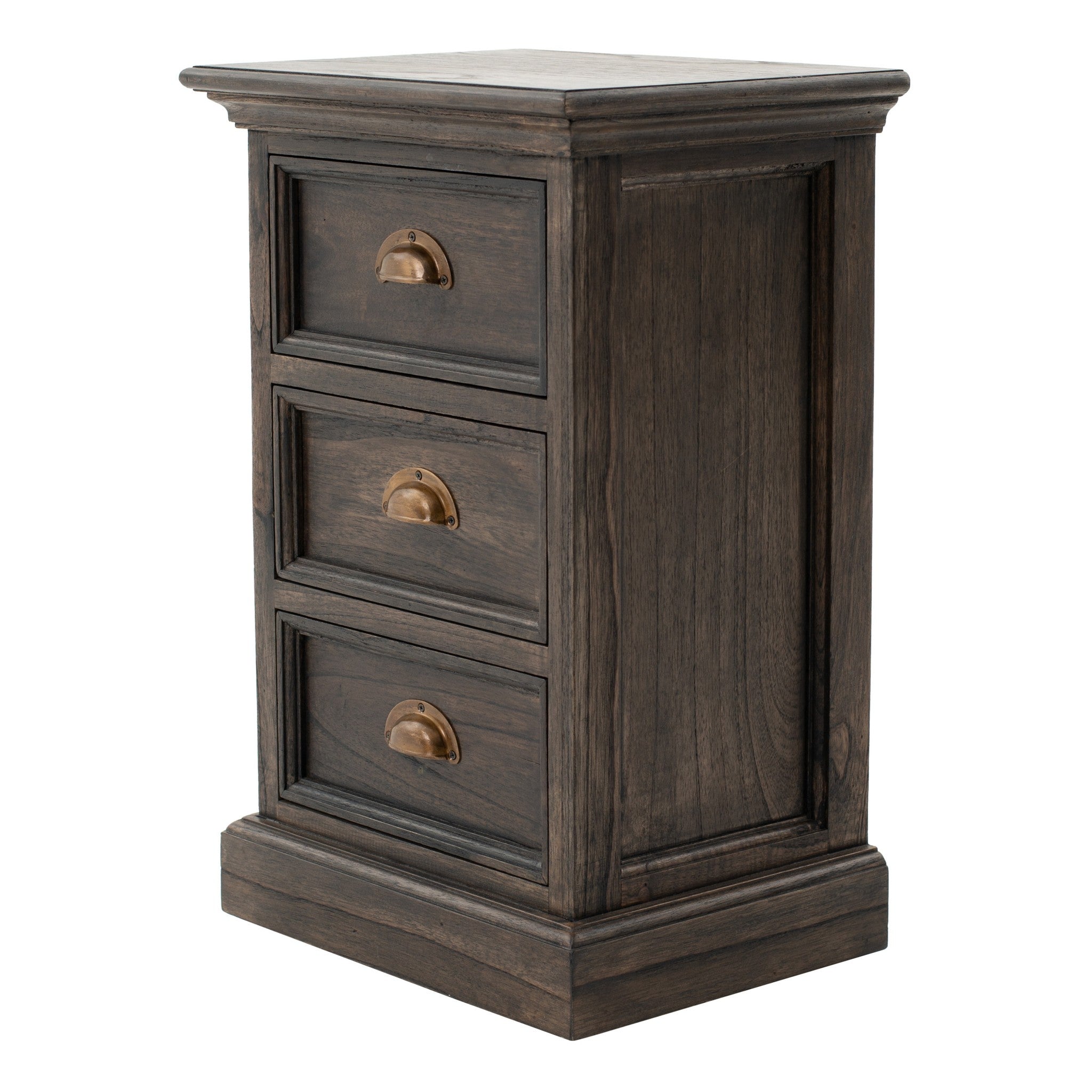 Exquisite in design, the Black Wash three drawer nightstand can compliment any decor or space. Ideally fashioned for the bedroom, this table can also serve as a side table in your living room. Handcrafted from kiln dried solid mindi wood with a black wash glaze and protective sealant finish, it is compact enough to even fit into narrow spaces. The table is equipped with three equally spaced out drawers with mild intricate carvings and antique brass hardware cup pull handles for easy access. Crown moldings adorn the edges of the smooth table top which is perfect to store your favorite book or reading lamp. Add a dash of elegance to your home with this stunning bedside table that definitely serves it's purpose. 23.62" x 15.75" x 11.81"