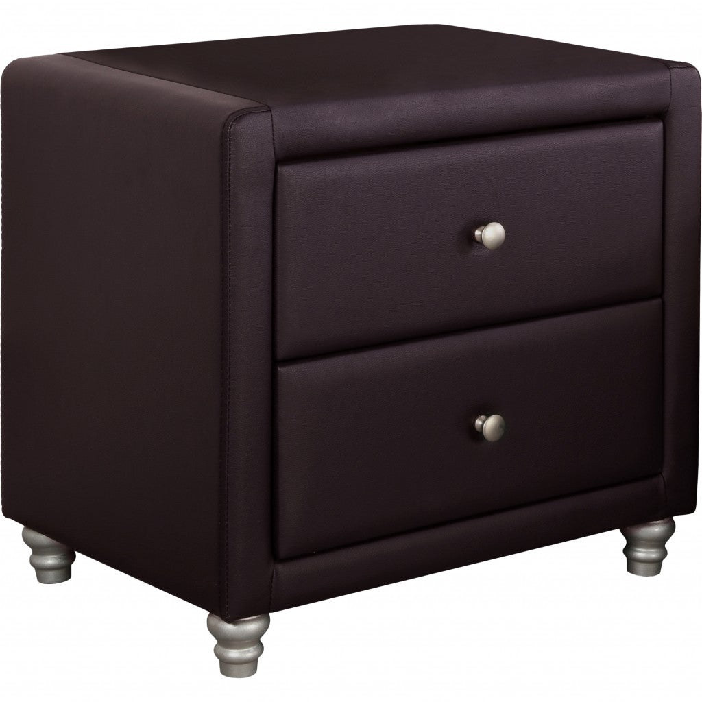 Our Brown Upholstered Two Drawer Nightstand in faux leather will compliments your bed beautifully. It has a brown coloring that looks great in any room. This two drawer nightstand is the perfect accompaniment, expertly retro-fitted with sleek rounded corners, brushed nickel drawer pulls and matching spool feet. Add the modern lamp of your choice and relax in style for many years to come. It is the perfect piece to add to your bedrooms aesthetic. 20" x 21" x 19.3".