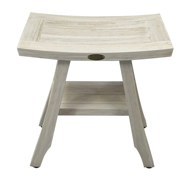 This gorgeous whitewash driftwood finish shower stool has a compact seat length design that provides that a great design statement in a compact space. The 18" height is the perfect height to use as a foot rest for shaving, but wide enough and sturdy enough to be a fully functional and comfortable seating shower bench. The bottom shelf is a handy addition to help keep clutter at bay. The indoor outdoor stain allows this bench to be used in the shower or anywhere in your house, for indoor and outdoor living. The included foot leveler pads allow independent adjustment of each leg to make minor adjustments for slight slopes in shower floors. The rubber foot pads also provide an non-slip stable surface for extra stability. In addition the foot leveling pads raise the teak legs off the floor of the shower so that the wood does not stay in contact with water, or damp shower floor surfaces when not in use. This will help prolong the life of the teak. This product is water resistant and suitable for indoor or outdoor use. Some assembly required.
