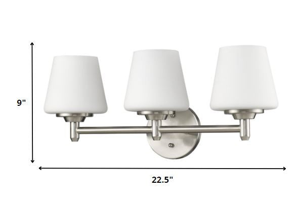 Add more brightness and style to your dressing room, or bedroom with this Three-Light Frosted Glass Vanity Wall Light. The wall bracket has a simple round design and has one small rod that attaches to the main horizontal rod. This horizontal rod holds up the three light shades that are placed equally. The shades are made of frosted white glass and have a typical lampshade shape. The contrast of the silver metal and frosted white glass gives this piece a very industrial look. This vanity light will look great no matter what colors or styles you already have and elevate the whole space. 9" H x 22.5" W x 7.5" D