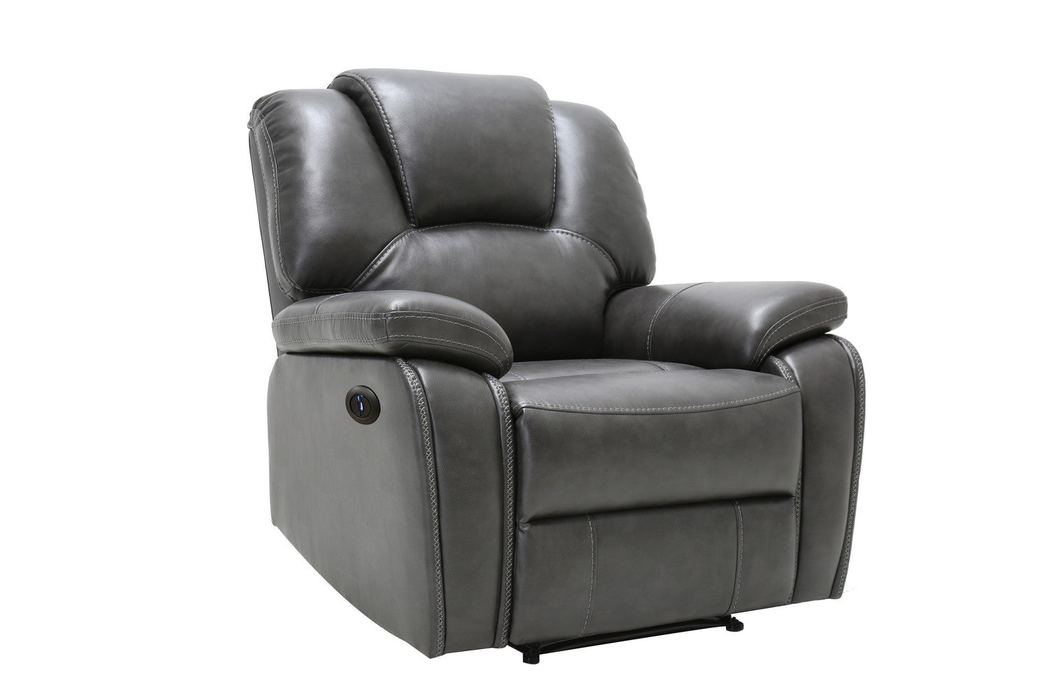 Introduce a blend of contemporary charm and pure functionality into the ambiance of your living room with this classy and comfortable power recliner chair. Not to mention how obviously well-made it is. This chair is a high quality piece and has a comfy grey leather upholstery. It will definitely leave a fantastic impression on your friends and guests. Additionally, this chair features a recliner mechanism, which will ensure even more relaxation. It truly mixes luxurious rest with durability perfectly. To complete the lovely look, it shows off a gorgeous style ideal for the contemporary home. As for measurements, theyre 40 for height, 39 for width, and 38 for depth, and it weighs 85 . When you need to wind down and loosen up after a long day, this chair is the best you can find. It will fit in excellently with any interior, and would be a marvelous decoration for your home.