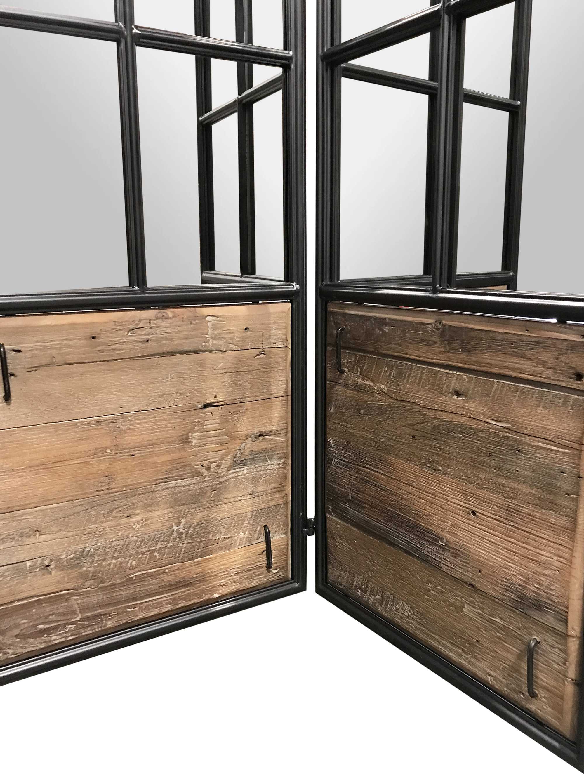 This room divider is made from 3 framed mirror panels. Clean design, features naturally distressed wood pieces at the bottom of each panel, giving this room divider an industrial feel. The mirror panels also give the optical illusion of more space, making any room of your home or office look bigger and brighter!