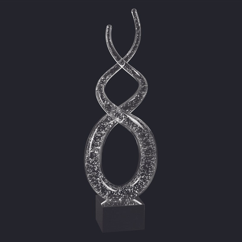 A stunner for sure, this Abstract Silver Sparkle Glass Centerpiece Sculpture combines just the right amount of abstract modern art with some sparkle and bold color that makes this piece a star. Rising up from the black crystal base the gorgeous glass with artistic bubbles and silver specks rises and twines in a unique and captivating design. 14" x 6" x 3"