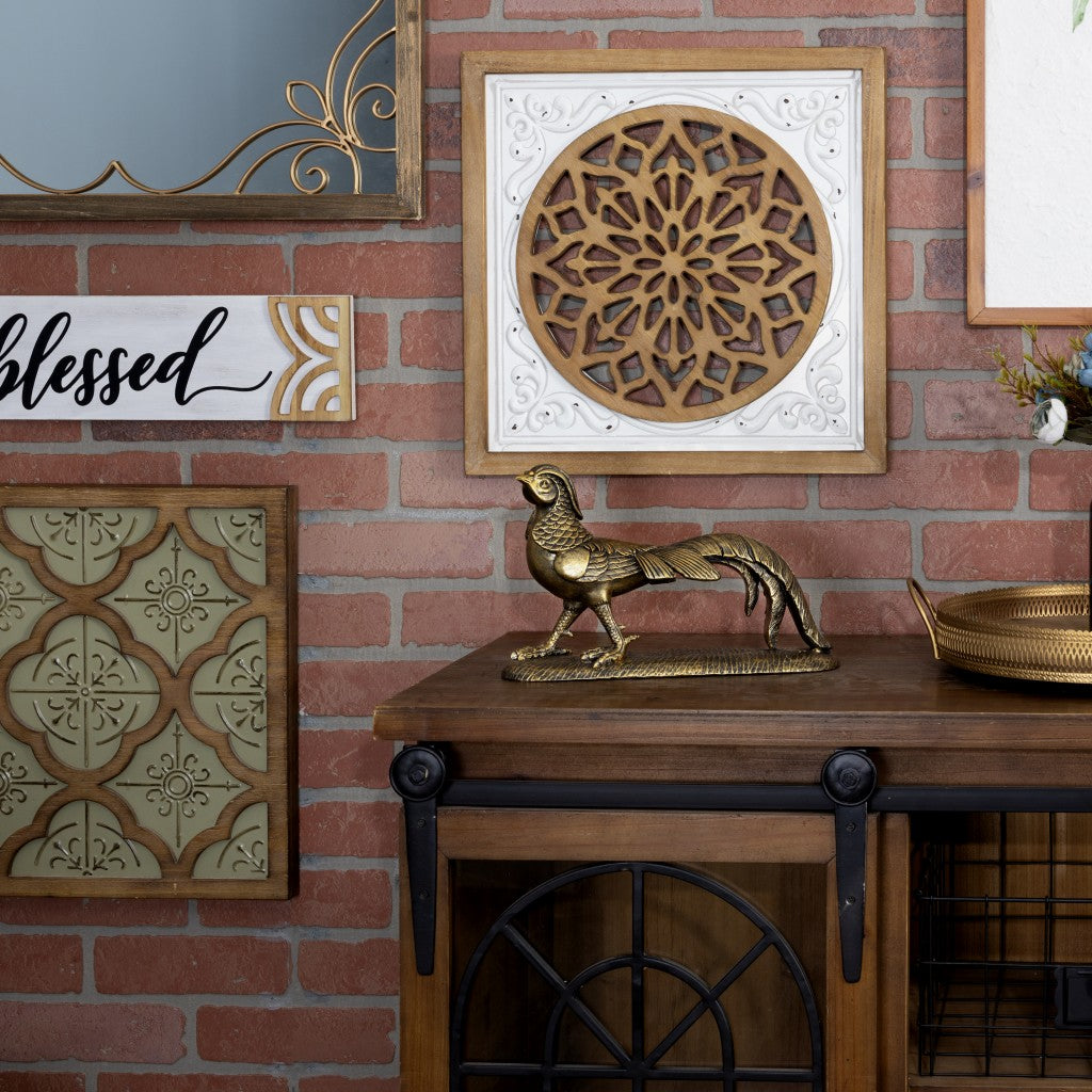 This Antique Gold Pheasant Statue is the perfect way to add a touch of nature-inspired contemporary decor to your home. This statue is made from solid metal which gives it durability and stability. The shape of the statue is a Pheasant bird with details of the feathers carved into it. The Pheasant has an elongated body which stand on top a metal plate with is curved to add more structure to the whole piece. The statue is finished off with an antique matte gold color. The darker details on top of the statue add depth and dimension to the whole piece and make it stand out even from afar. You can use this statue in anywhere in your home no matter the interior styles or colors you have. The minimal yet realistic nature of the statue makes it a great and unique accent for your office, desk, mantle, or bookshelf. 7" H x 11" W x 3" D