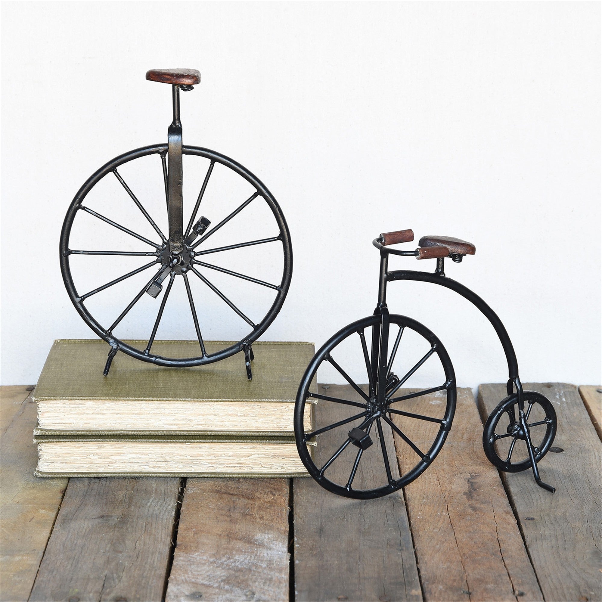 A mixture of art and design, this Traditional Bicycle Sculpture will make a great addition to the decor in your home. This miniature bicycle is made from iron and features a traditional design with one big wheel at the front and smaller wheel at the back. The body of this bicycle is colored in a black finish. The seat and the handles are made from wood and have a dark brown stain on them. This piece will look great in any room of your home and can be used as formal or whimsical decor. Use it in your library, your living room or even in a child's playroom. 8.25" H x 2.75" W x 10" D