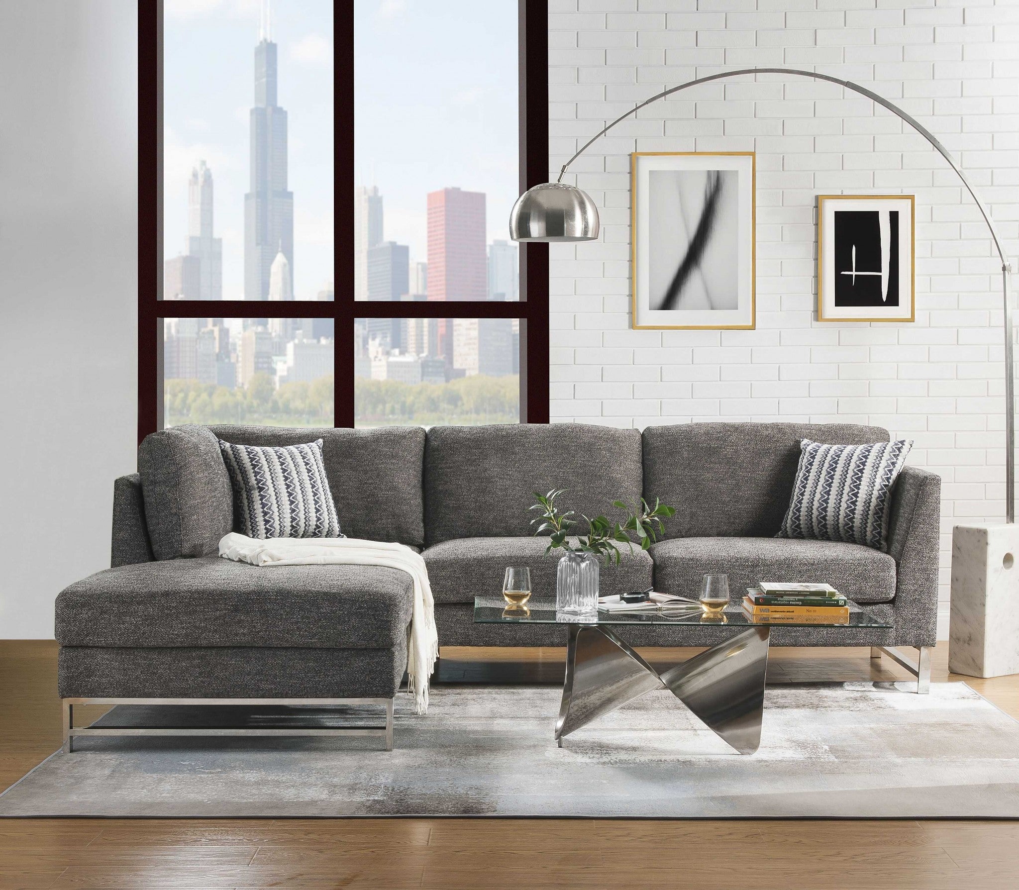 gracefully modern! this l shaped sectional sofa will add alluring vibes to any modern space. it sports a brilliantly stream-lined shape with shelter arms and chrome-finished sled base. it is firmly rested on sturdy metal legs to provide balance and support. meanwhile, it boasts of solid upholstery in ultra-soft gray linen fabrics which will blend with the existing decor. this sofa is spacious and cozy enough to become your favorite snug up spot. it also showcases a right facing sofa and a left facing chaise. it is accompanied with contrasting accent pillows for extra cushioning. you can make this stunning chair the center of attraction in your home. it is available for the size of 75 by 113 by 36 inches.