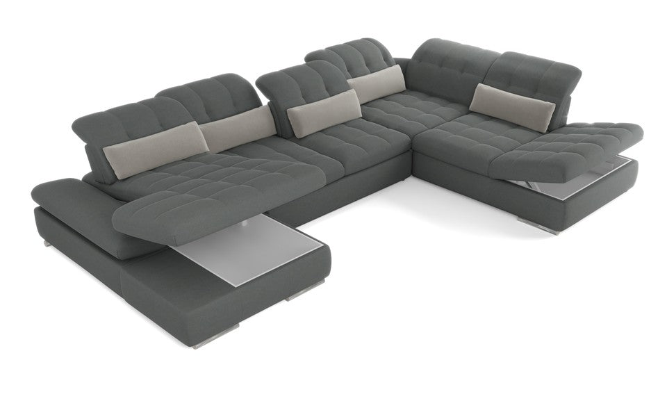 The Mod Dark Gray Five Piece Left Arm Sectional with Storage and Sleeper is the perfect solution for your contemporary everyday life. This solid color sectional is made of the strongest, highest performance microfiber around, thus making it ideal for high traffic areas that get lots of use. Spill and stain resistance means it is a great option for areas with kids and or pets. Superior construction makes this sofa set not only super durable but extremely comfortable as well. This fabulous sectional includes 5 bolster low back support pillows in a coordinating lighter color to create a perfect designer look. The chaise lounge on the left makes this sofa is great for lounging or napping. The modular pieces can even be moved around to create a queen size bed area for true sleeping. The low arm rest and the chaise components open for lots of storage which is a great place to stash games, supplies, blankets and extra pillows when not in use. This special sectional also includes movable seat backs which allow you to adjust the depth which is a unique and great feature to be able to adjust for shorter or taller users. Raised off the floor with sturdy stainless legs, this left side long sectional features wide arms for comfort and convenience and has an air of modern design but is classic and transitional enough to fit in most any decor. 31.5" x 156" x 105"
