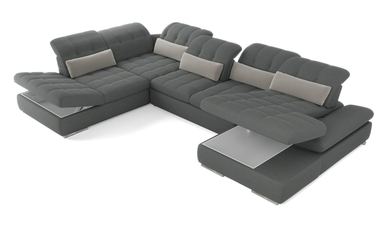The Mod Dark Gray Five Piece Right Arm Sectional with Storage and Sleeper is the perfect solution for your contemporary everyday life. This solid color sectional is made of the strongest, highest performance microfiber around, thus making it ideal for high traffic areas that get lots of use. Spill and stain resistance means it is a great option for areas with kids and or pets. Superior construction makes this sofa set not only super durable but extremely comfortable as well. This fabulous sectional includes 5 bolster low back support pillows in a coordinating lighter color to create a perfect designer look. The chaise lounge on the right makes this sofa is great for lounging or napping. The modular pieces can even be moved around to create a queen size bed area for true sleeping. The low arm rest and the chaise components open for lots of storage which is a great place to stash games, supplies, blankets and extra pillows when not in use. This special sectional also includes movable seat backs which allow you to adjust the depth which is a unique and great feature to be able to adjust for shorter or taller users. Raised off the floor with sturdy stainless legs, this right side long sectional features wide arms for comfort and convenience and has an air of modern design but is classic and transitional enough to fit in most any decor. 31.5" x 156" x 105"
