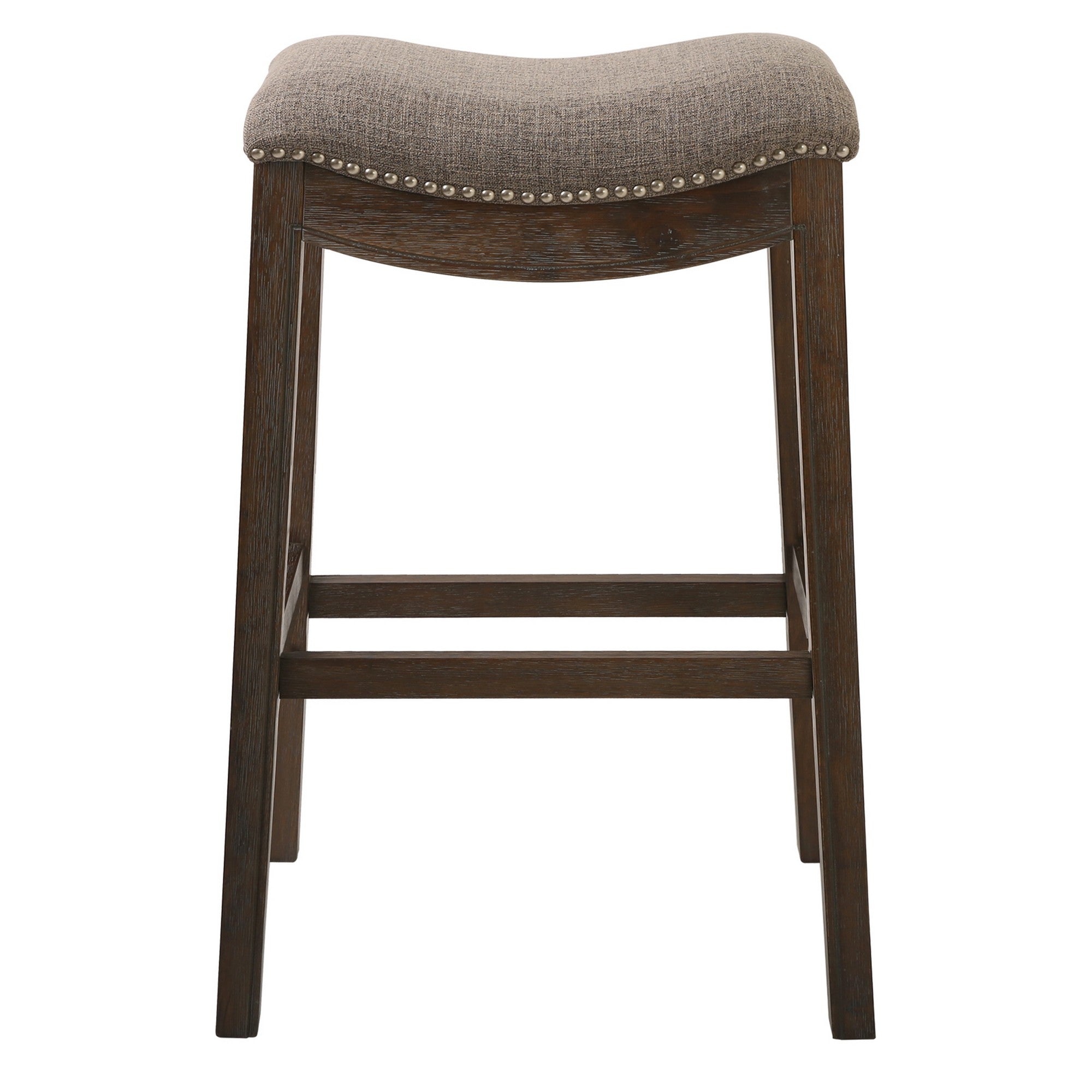 Bar Height Saddle Style Counter Stool with Taupe Fabric and Nail head Trim