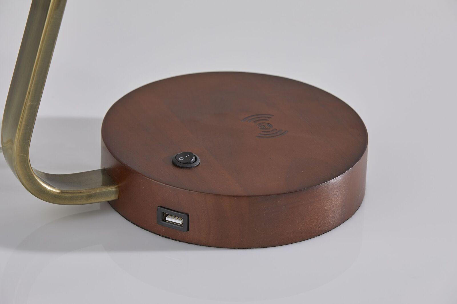 This wireless charging table lamp combines Palm Desert, mid-century style with high-tech features. A thick walnut wood base encases a hidden Qi wireless charging pad. Just place your phone onto the wood base, and your phone will charge right up! Many phones have Qi technology built-in already, but for those that don't, a USB port is conveniently located right in the base as well. Antique brass metal is paired with an off white fabric shade, revealing a beautiful texture when lit. All lighting product is either UL or ETL listed, meaning that it has been tested and approved to meet the government-regulated safety standards for the USA. Bulb is not included.