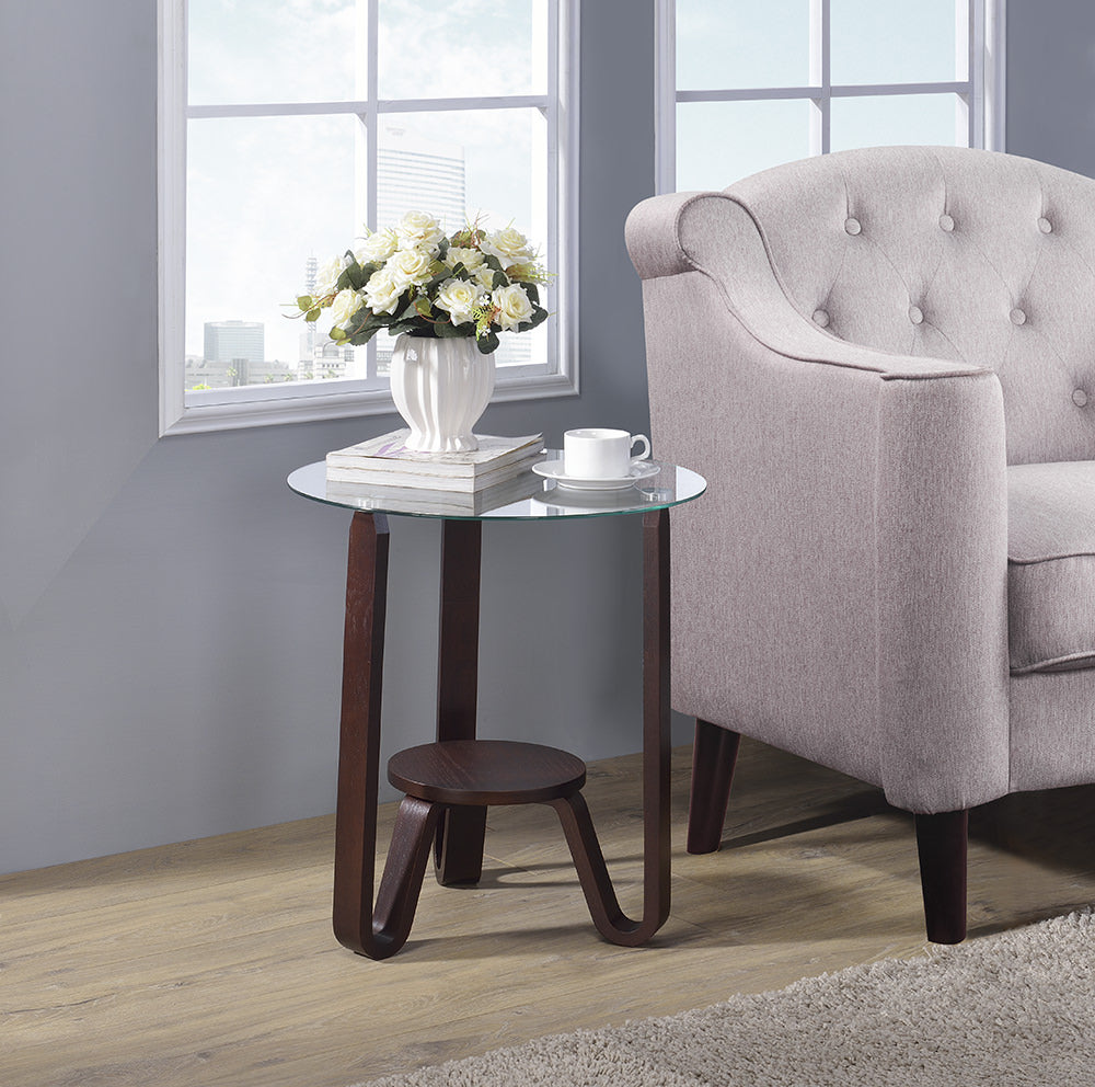 This end table presents an incredible combination of wood and glass. It features a dark walnut frame exquisitely chiseled to charming brilliance. This round occasional table stuns with a clear tempered glass top resting delectably on V shaped legs. It is also pitched with an open lower shelf to cater for your storage needs. Have it stand elegantly in your dining or kitchen section, where it will create an outstanding visual appeal. This showpiece highlights smooth curves streamlined to fit into modern spaces. It is further embellished with veneer trimming in an alluring dark walnut finish. It is available in the size of 20 by 20 by 22 inches.