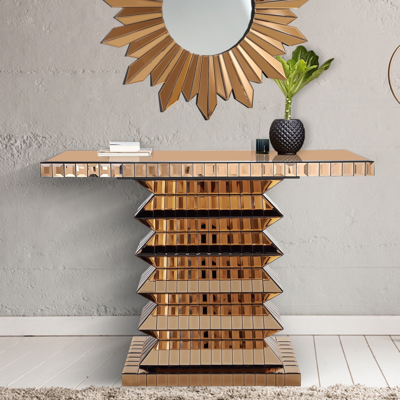 The Gold Chiseled Console is nothing short of breathtaking! This exquisite piece offers high-end appeal at every turn. With its gold coloring, this statuesque console is fully prepared to become the statement piece in your home, especially with its beautiful chiseled design. The Gold Console will simply shimmer, as the chiseled base captures every bit of light. 32.7" x 46" x 15.7".