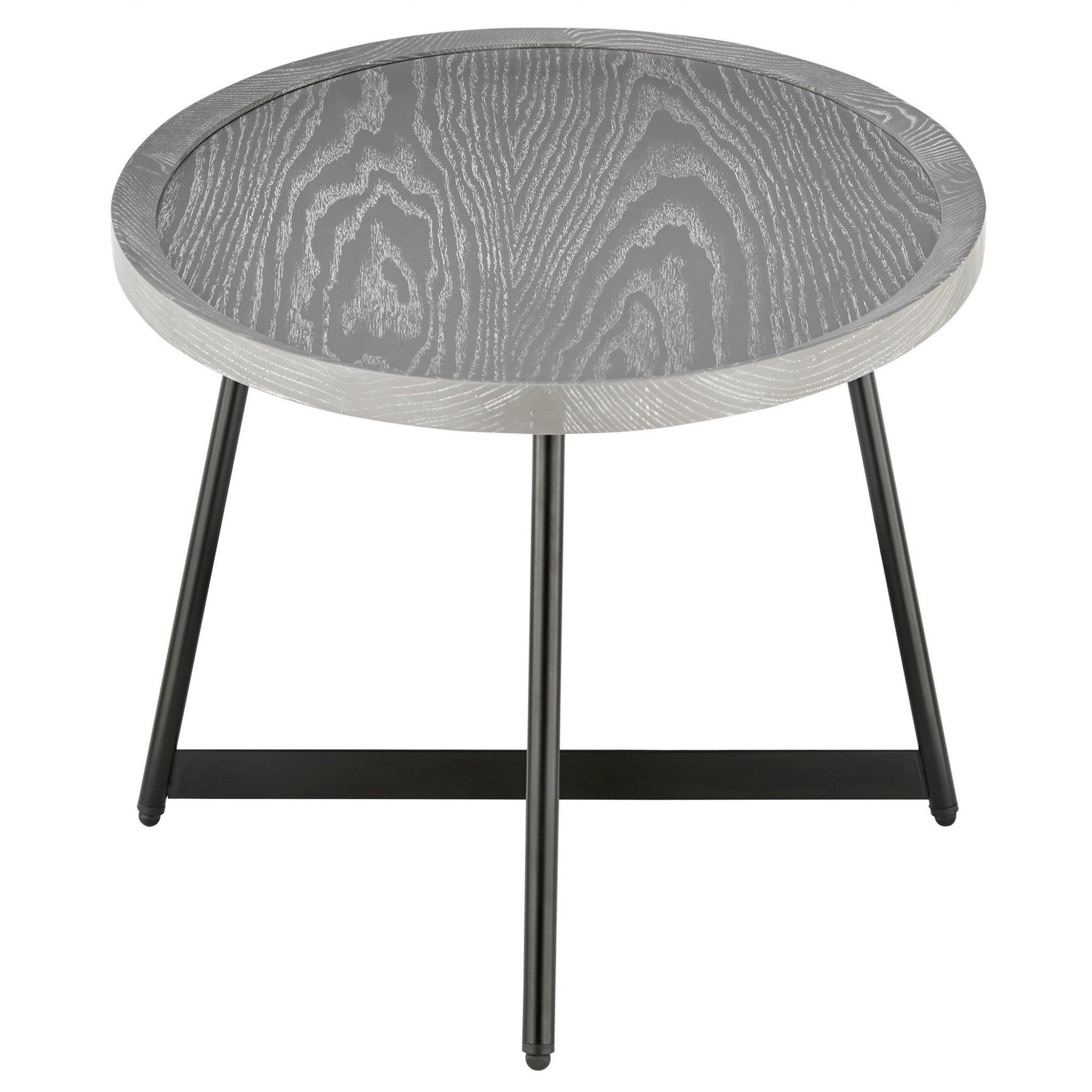 This Modern Gray and Black Round Side Table is the perfect way to add some much needed design and utility to any space in your home. The geometric and minimalist open base of the table is made from the highest quality steel and is colored to a powdered jet black finish. The table top itself is made from wood and oak veneer that is beautifully stained with a light gray that has a wash over it and lets the grains show through it. The shape of the table top is round and it has a raised outer edge lip all around to prevent items from sliding off. Masterfully modern, this side or end table is a striking and fabulous way to bring contemporary form and function to your space. 22.05" H x 21.66" W x 21.66" D