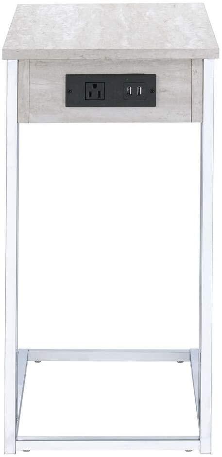 This Modern Gray Oak and Chrome C Shape USB Side Table is a stylish yet practical piece, perfect for your living room. It's C-shape structure makes it easy to set up next to your sofa in spaces where there isn't room for a free-standing larger coffee table. It features a chrome, metal stand and a wooden, gray oak finish top. It also includes a USB charging port and three pole charging outlets enabling you to easily power your devices while relaxing. There is also a useful additional shelf for extra storage. 24”x 12”x 18”.