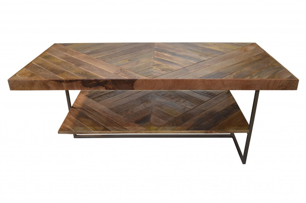 Incorporate this expertly designed Rectangular Wooden Coffee Table with Storage into your living room to create a classic industrial look. The natural wood stains and slanted texture of the rectangular top and lower storage shelf beautifully harmonize with the brass-colored iron frame. This coffee table is meticulously crafted from mango wood for long-lasting durability that will stay in style without losing its natural tone and texture. The spacious tabletop is ideal for serving drinks and snacks or displaying decorative accents, while the lower shelf caters to your storage needs for miscellaneous items such as magazines, books, newspapers, and more. The earthy tones and organic vibe of this coffee table will add warmth and character to your traditional living room. 48” x 24” x 19”