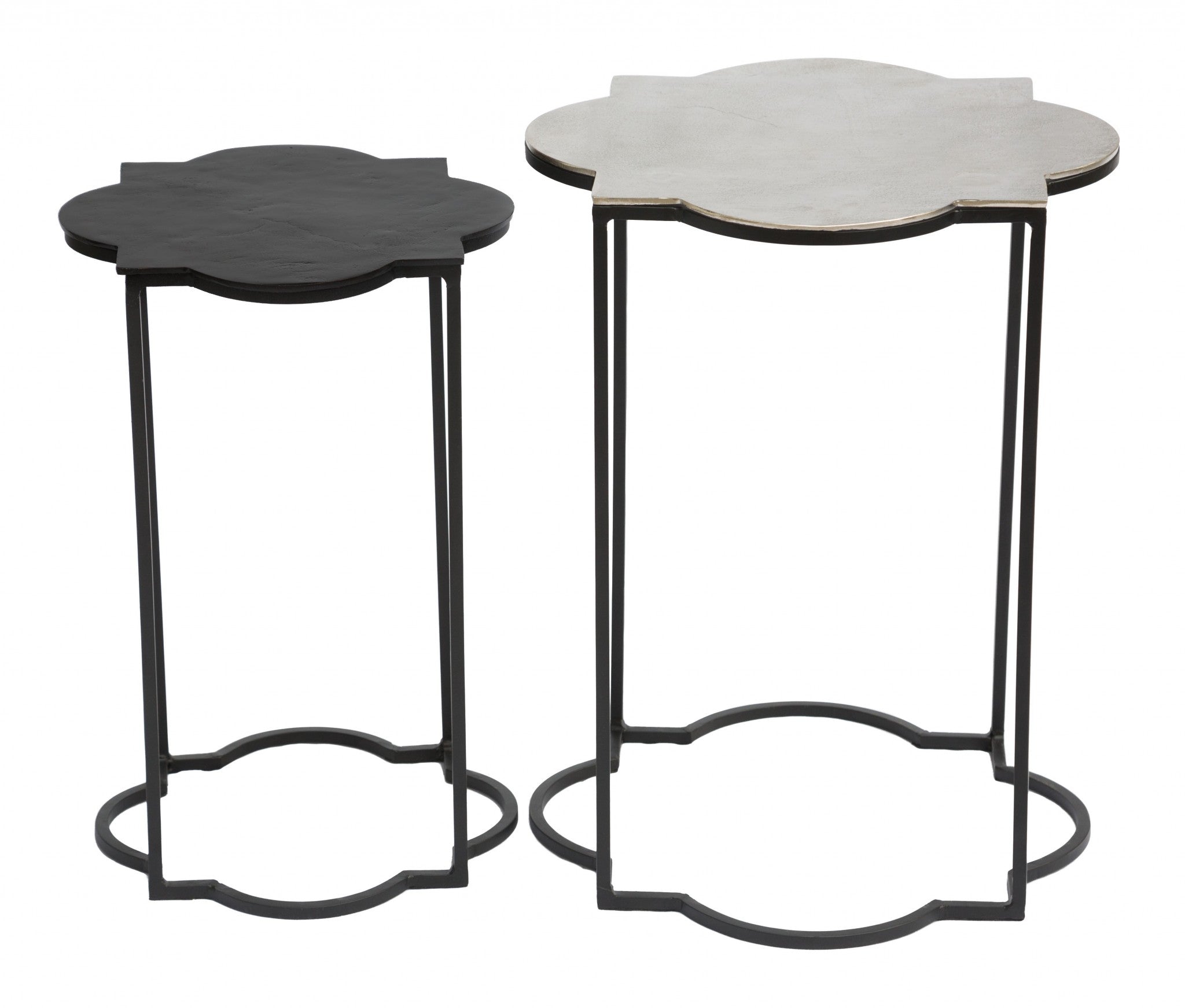 Bring in a touch of style to any room in your home with this Set of Two Eastern Accent Tables. There are two tables in this set with steel frames colored to a powdered black finish. The base of each table features an eastern inspired motif that mimics the shapes of the table tops. There are four rods that rise up and attach the base to the table top. The larger table has a white table top while the smaller one has a black table top. Use these tables in the same room or around the home as you see fit. 20" H x 15.8" W x 15.8" D