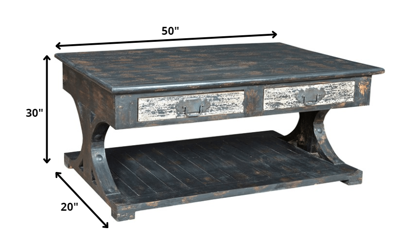 True to the elements of vintage farmhouse styling, this Teal Distressed Storage Coffee Table accentuates a rustic appeal with its structural detailing and aged textures. Featuring a rectangular design in a for step distressed teal blue finish with rich stains of white and brown to induce a timeless touch while providing two drawers and a lower shelf for additional storage space. Expertly crafted by skilled artisans, this wooden coffee table is meant to serve for a long time both as a decorative and functional piece in the room. Make your family gathering feel more inviting as you bring home this timeless piece of décor that will evoke a sense of warmth in the atmosphere. 50” x 30” x 20”