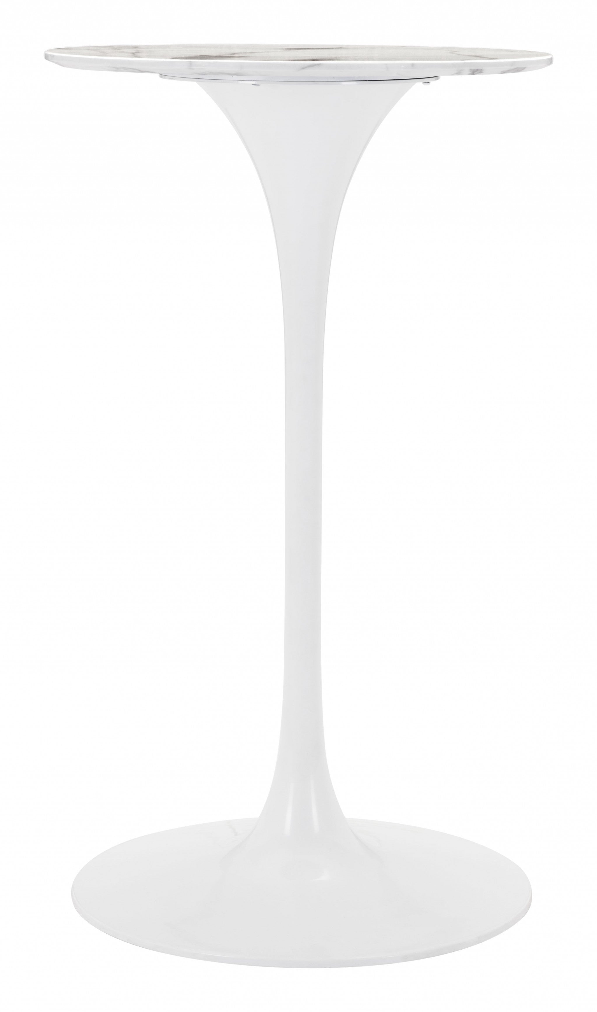 Bring in a touch of contemporary design to any space in your home with this White Marble Pedestal Bar Table. The base of this table is made from solid steel and is colored to an opaque white finish. The circular base has a tapered rod attached to it which then holds the circular marble table top in place. This table has a tall stature which means it can be used as a statement table somewhere in your home or you can utilize it as an extra surface for serving food and drinks or just displaying decor. 42.9" H x 24.8" W x 24.8" D