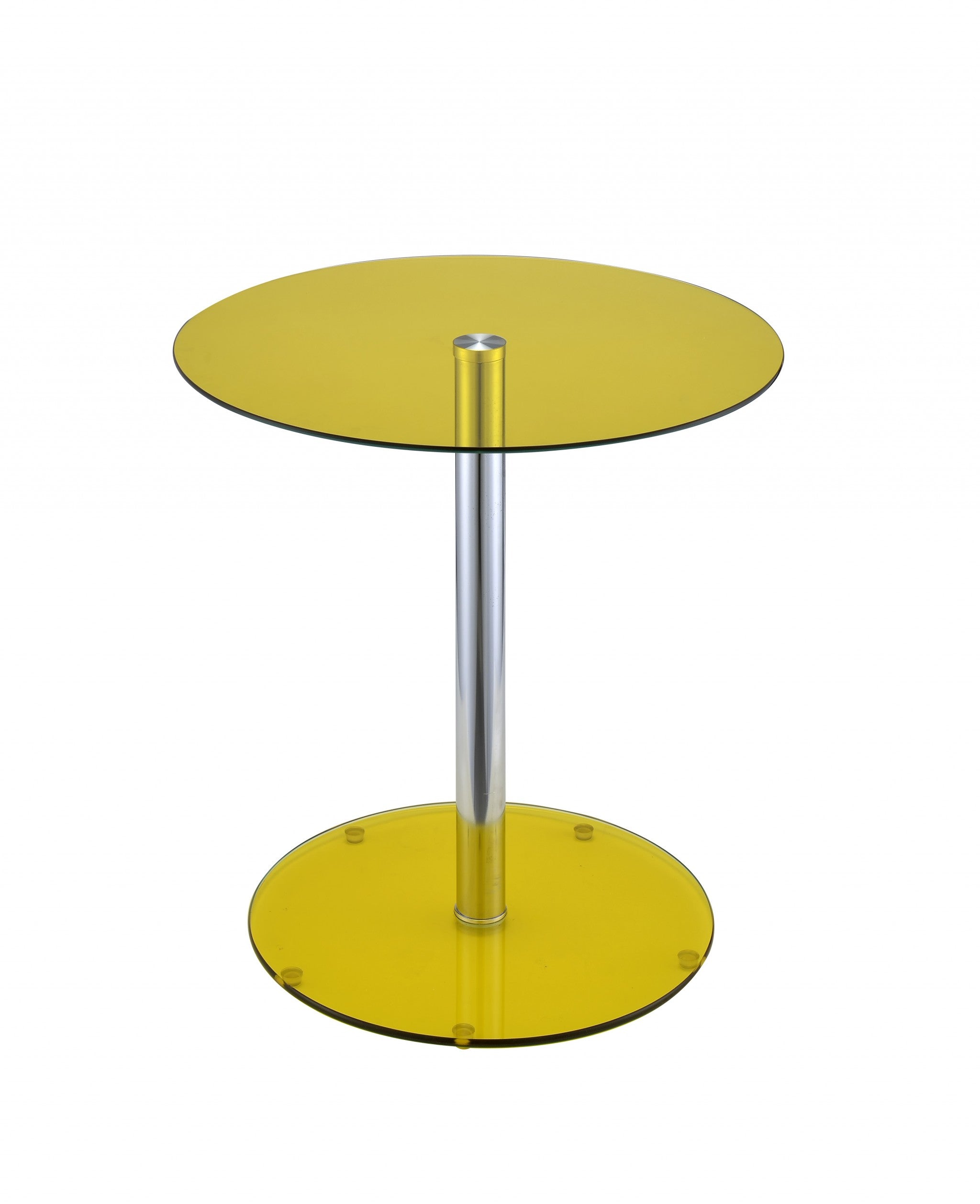 Looking to add a fun splash of colour to your home? Our Yellow Glass Double Sphere Side Table will do exactly that. Made with a solid chrome tube centre, this table is complete with two glass spheres at the base and the top. The coloured glass is both eye-catching and functional, working as an ideal table top for your drinks or a small lamp. It's bold colour, yet minimalistic design would work well in brighter more modern interiors. 20" X 18" X 18"
