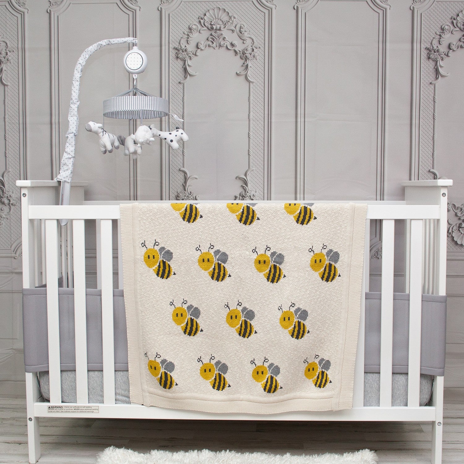 Get this assiduously crafted Ivory Honeybee Knitted Baby Blanket and express love with your baby. This beautiful baby blanket is lightweight and features little busy buzzing bees. Neutral in tone, this swaddling blanket is soft, stretchy, and made up of 100% cotton. Due to its gentleness and unique look, this stylish baby blanket is a perfect companion for your loved ones. 32" x 40"