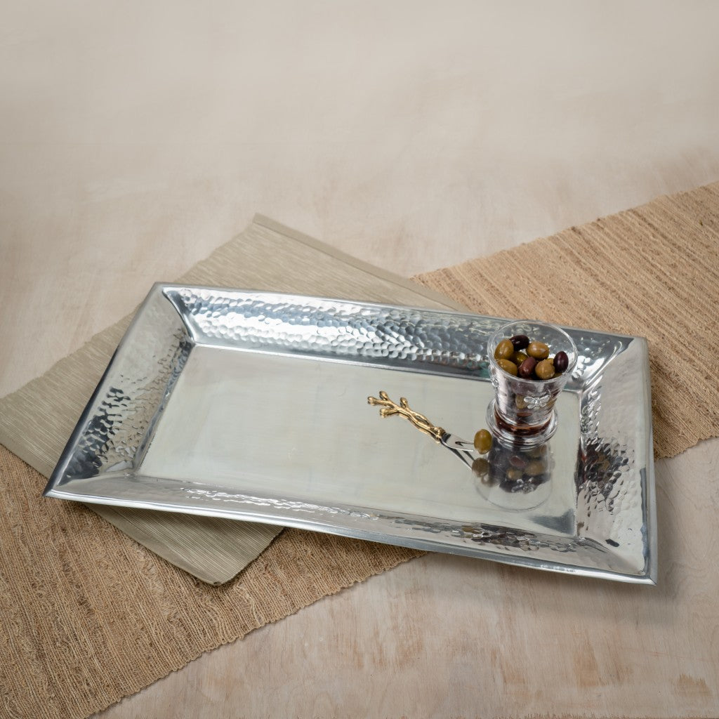 A gorgeous work of art, this Handcrafted Hammered Stainless Steel Rectangular Tray is the perfect accent for your table. Utilizing a labor-intensive hand hammering procedure this rectangular tray with hammered border and shiny center will be great for display or serving. Dress up your table, vanity, or hutch with this lovely and versatile centerpiece.
