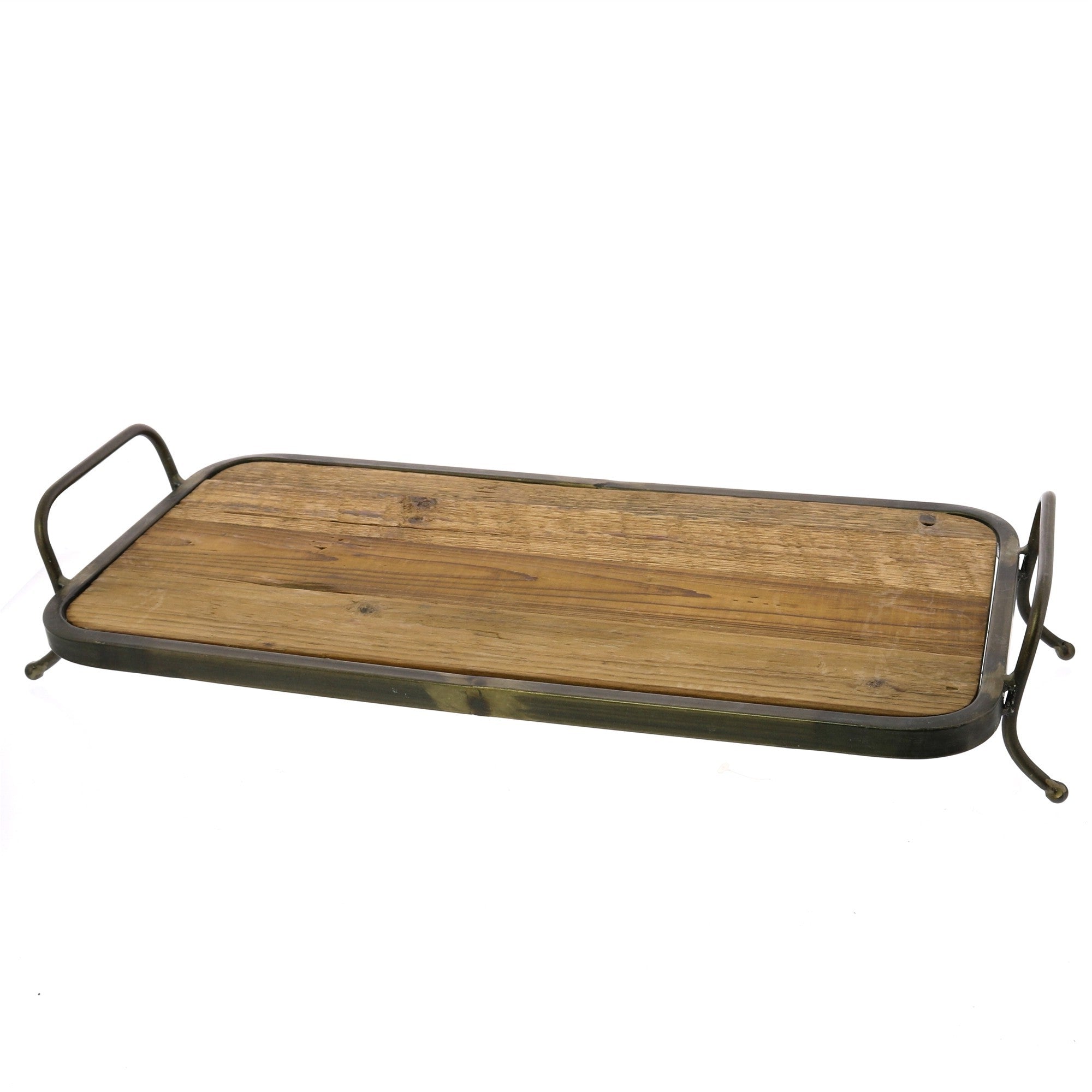 You can add a touch of rustic design to your home with this Rectangular Wooden Tray with Metal Edges. The main part of this tray is made from solid wood panels which are arranged in a rectangular shape. The natural varnish on top shows the wooden grain and details through it and adds character to the overall look. Around the perimeter of this wooden part, there is a black metal edge. There are two metal handles attached to this metal edge which curve at the bottom and create legs for the tray to stand on. This tray can be used a serving tray or as a decorative tray. 4" H x 20.5" W x 8.75" D